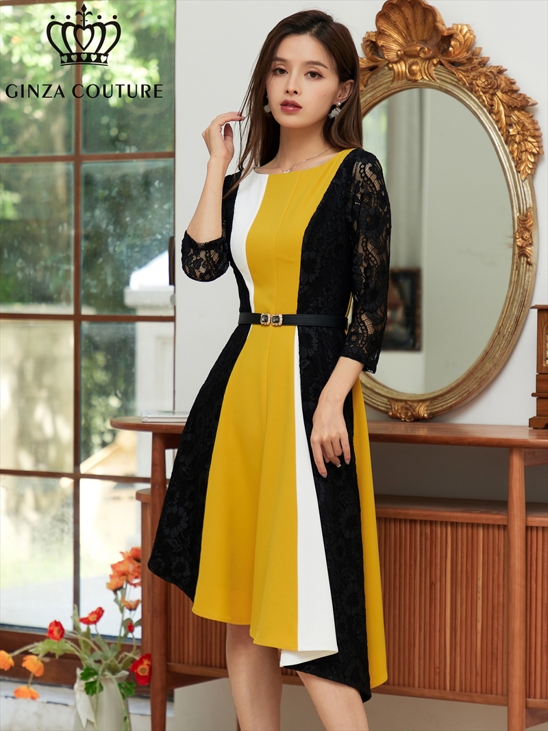 [GINZACOUTURE]イエロー×ブラック・トリコロール・ ブラックレース・ アシメントリー ・七分袖 ・ミディアムドレス ・ワンピースワンピース、パーティードレスの通販ならエルケイ(ERUKEI)