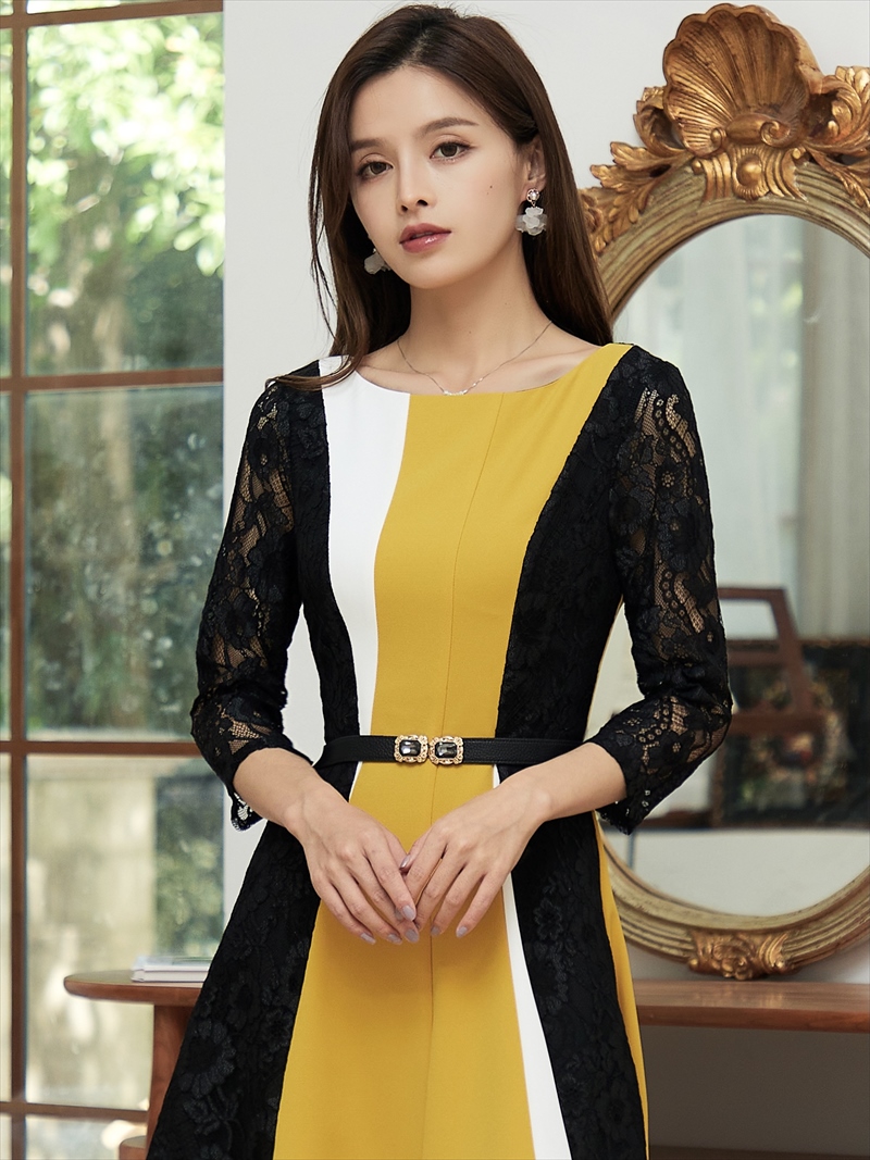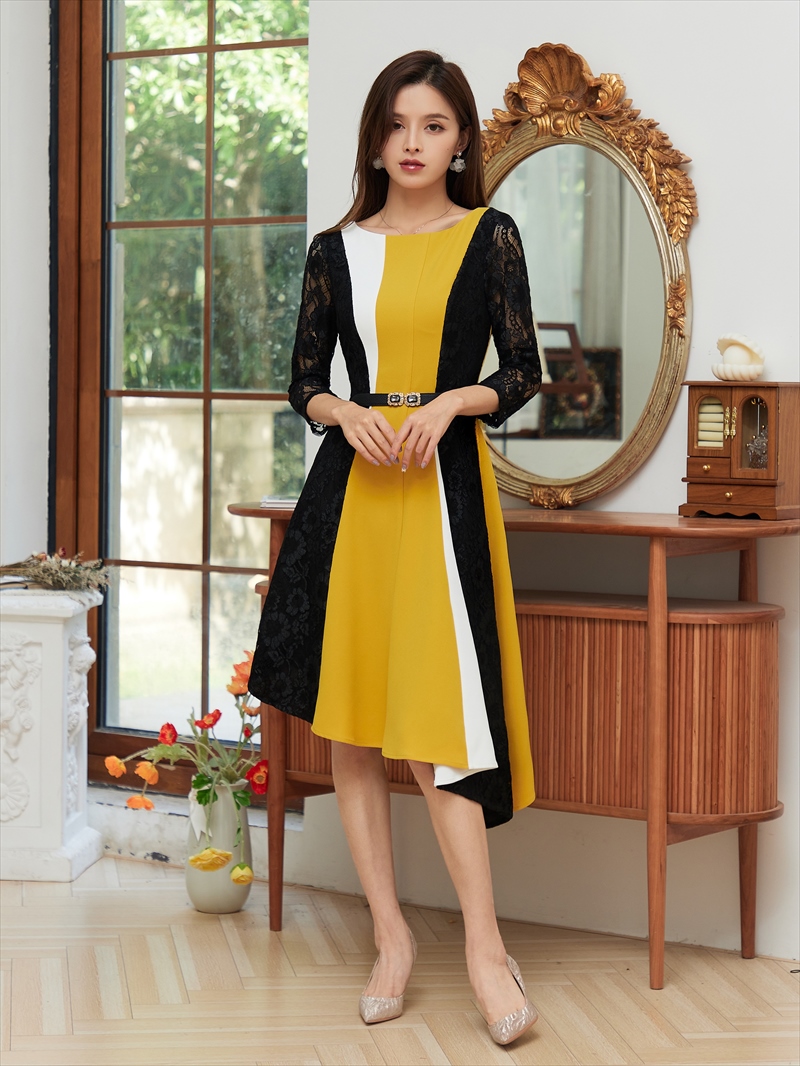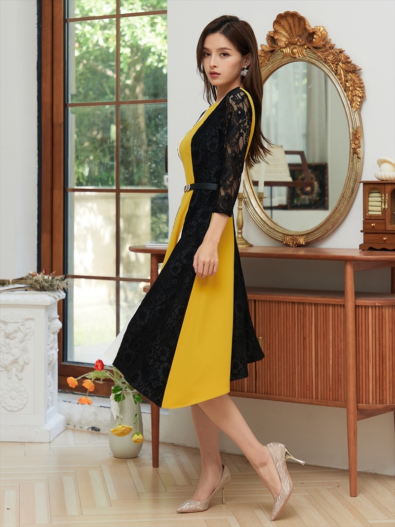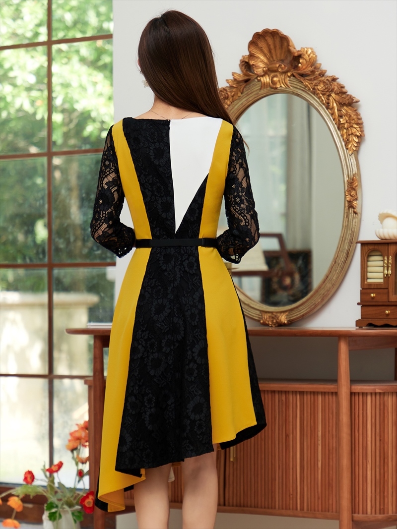 [GINZACOUTURE]イエロー×ブラック・トリコロール・ ブラックレース・ アシメントリー ・七分袖 ・ミディアムドレス ・ワンピース [c31406]