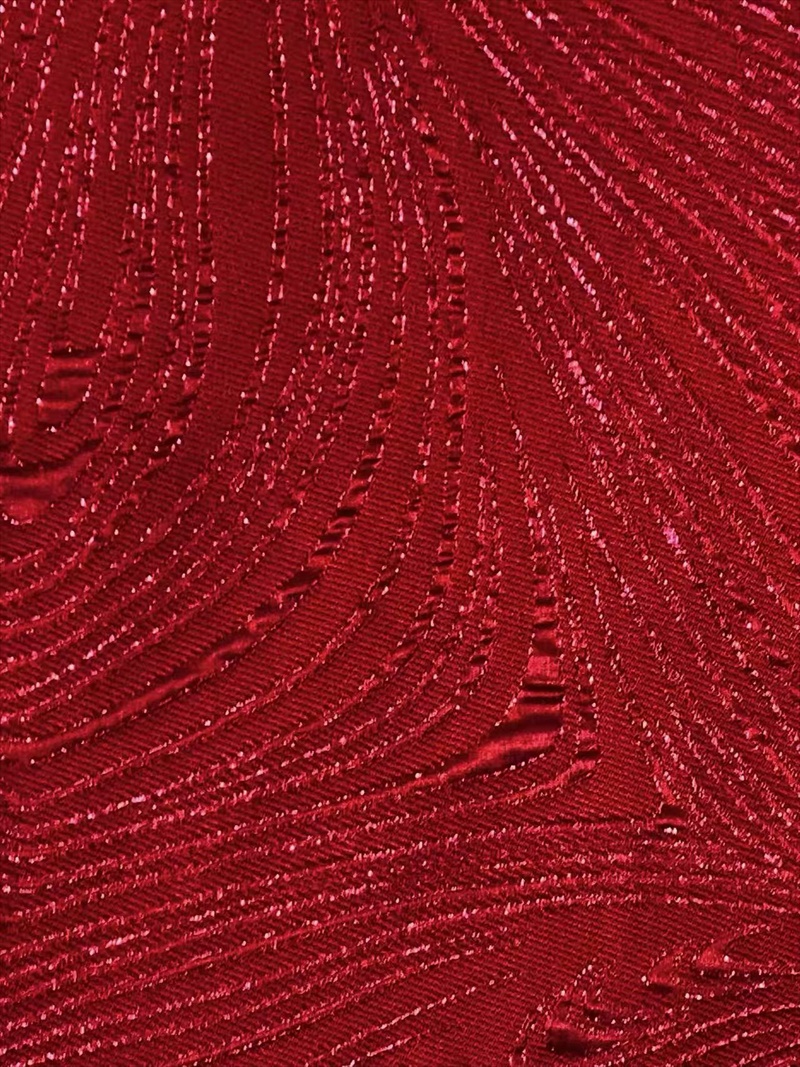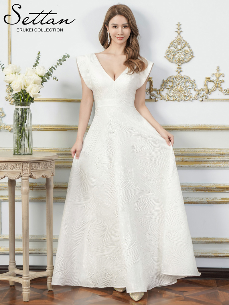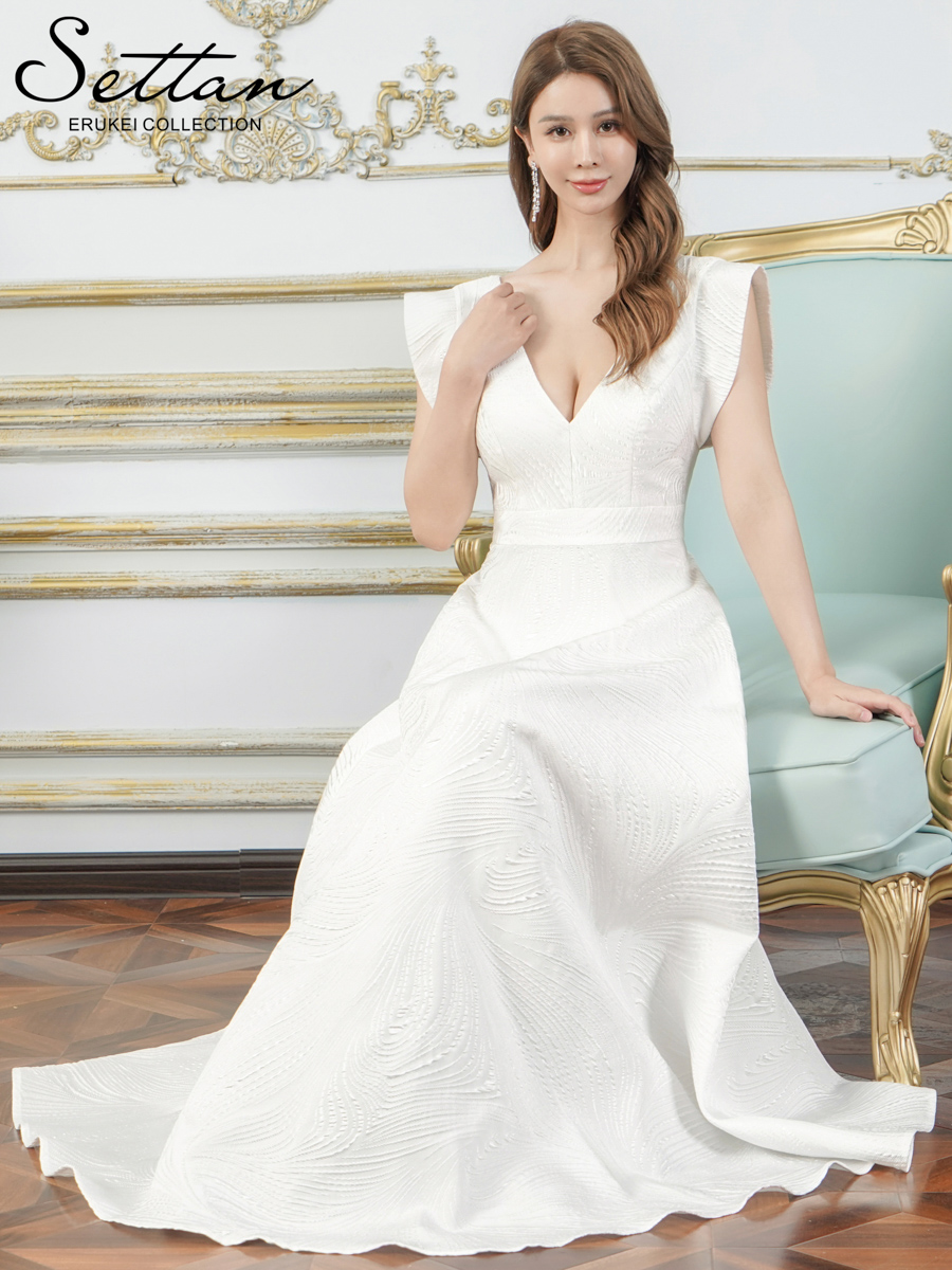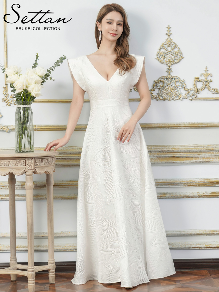 [送料無料][SETTAN]ブルー・ホワイト・アンゴラレッド・シンプル・ジャガード・ハイウエスト・フリルスリーブ・Vネック・Aライン・ロングドレス [即日発送][大きいサイズあり]