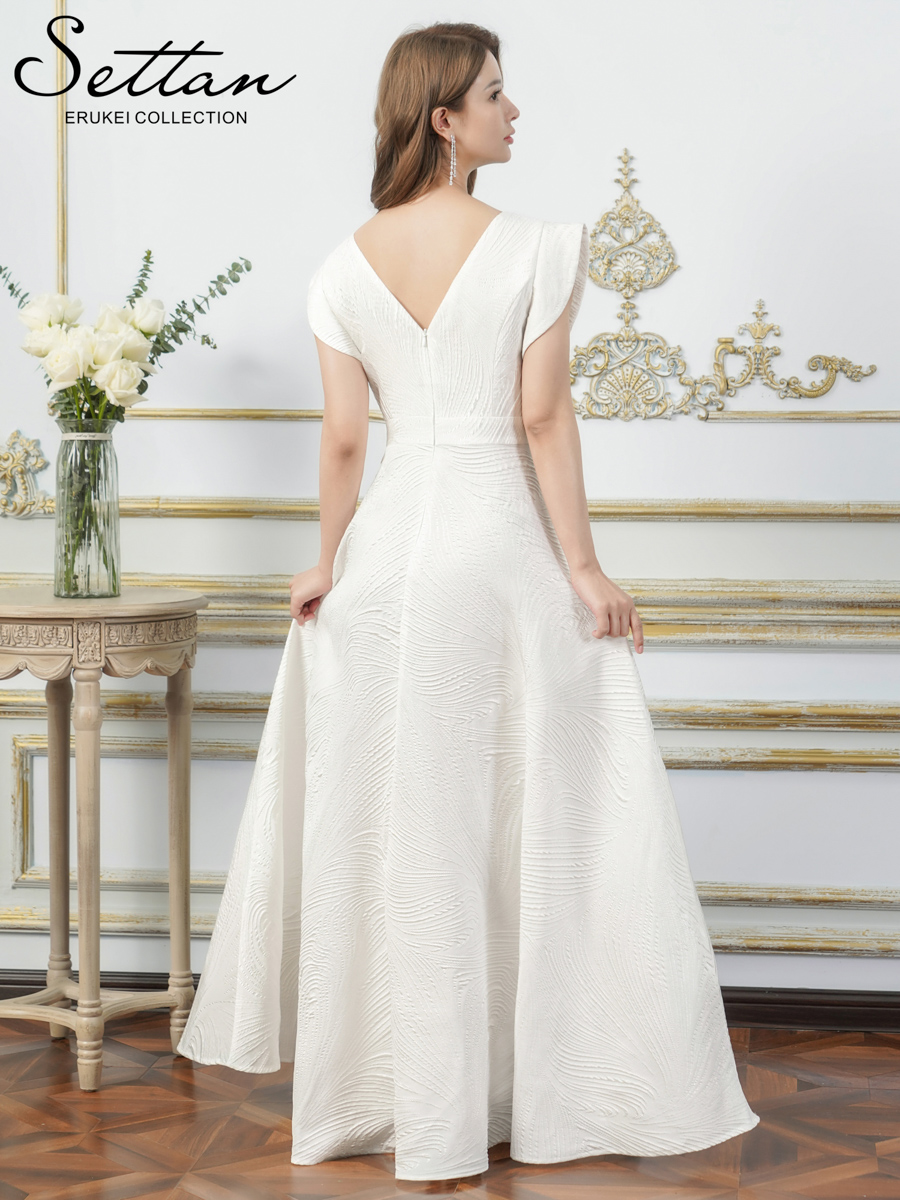 [送料無料][SETTAN]ブルー・ホワイト・アンゴラレッド・シンプル・ジャガード・ハイウエスト・フリルスリーブ・Vネック・Aライン・ロングドレス [即日発送][大きいサイズあり] [S22106]