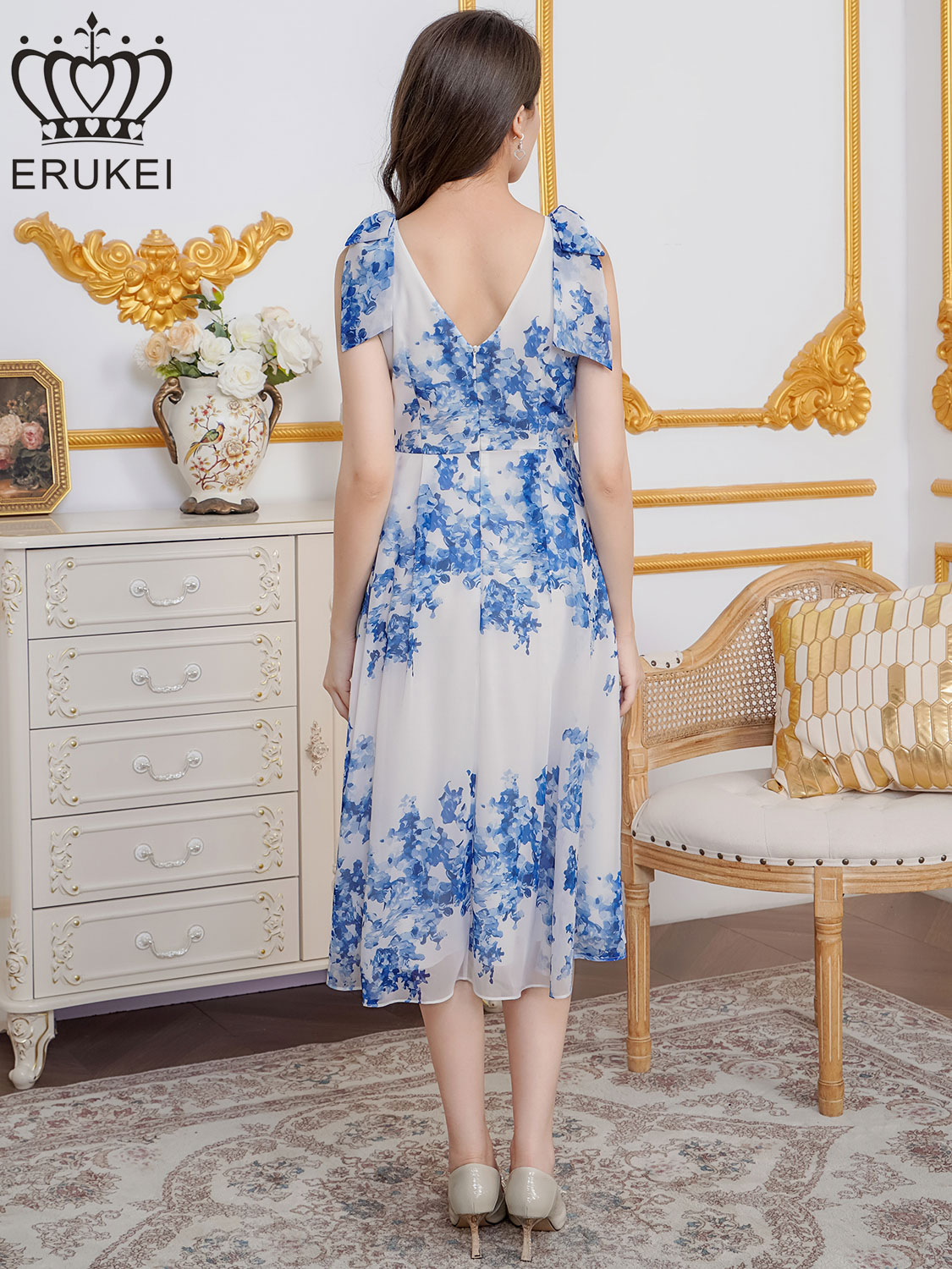 [送料無料][ERUKEI]ホワイト×ブルー・花柄・プリント・シフォン・Vネック・ノースリーブ・肩リボン・タック・フレア・Aライン・ミディアムドレス・ワンピース[即日発送][大きいサイズあり] [E25190]