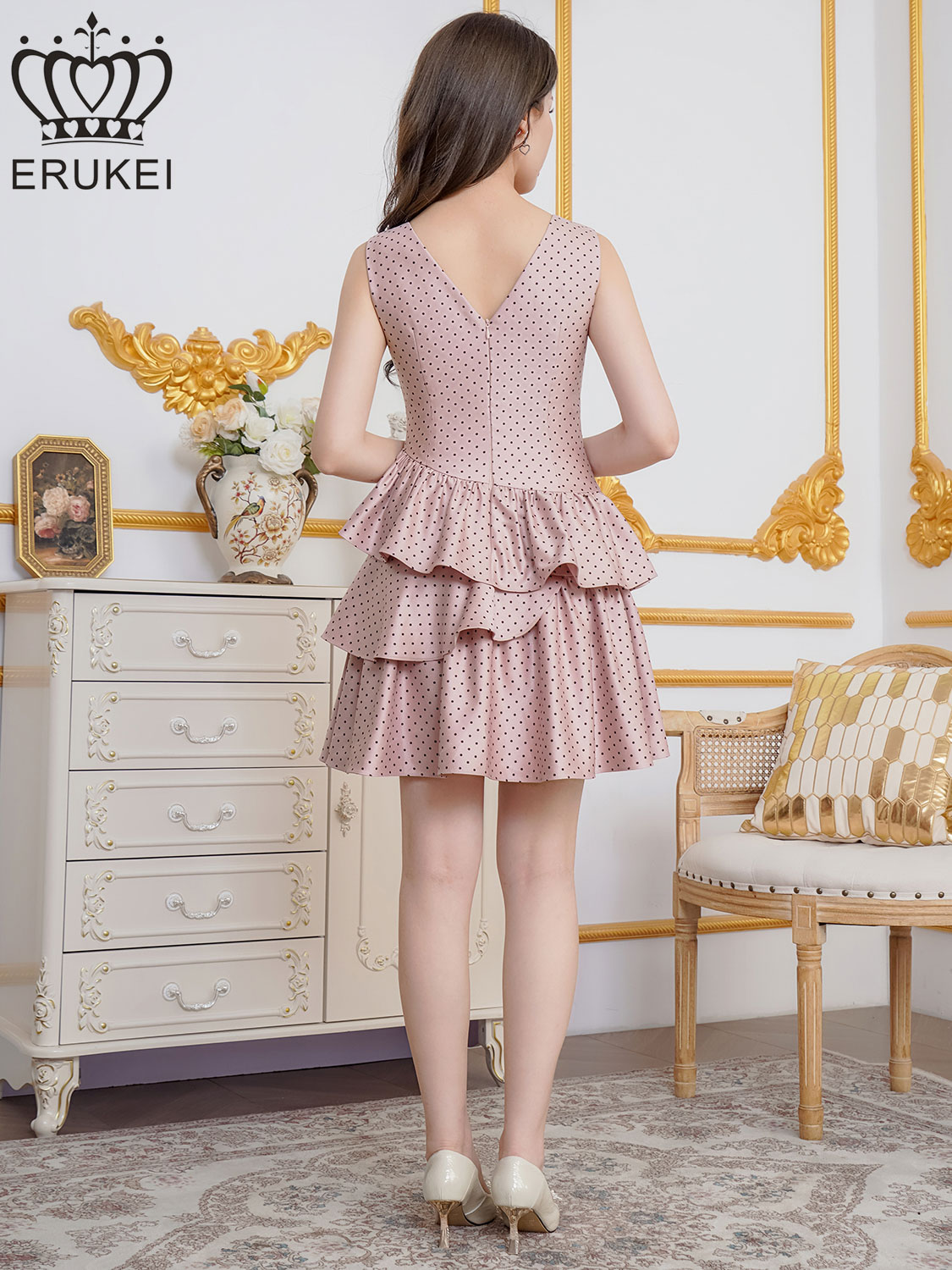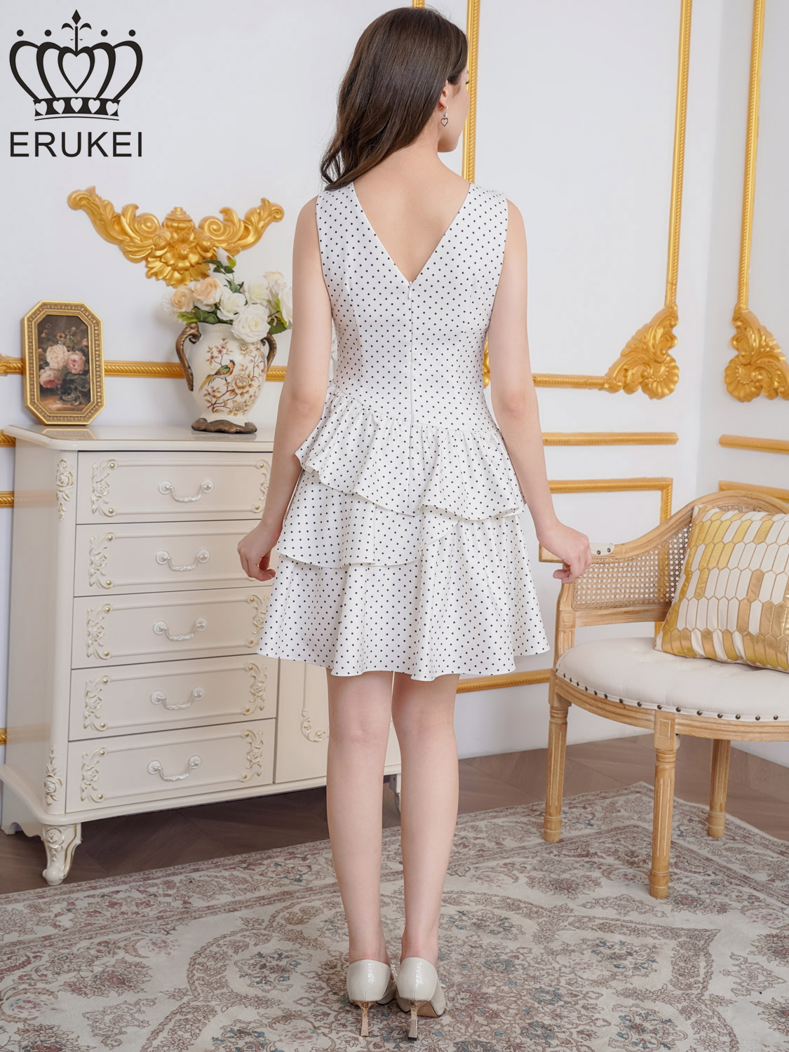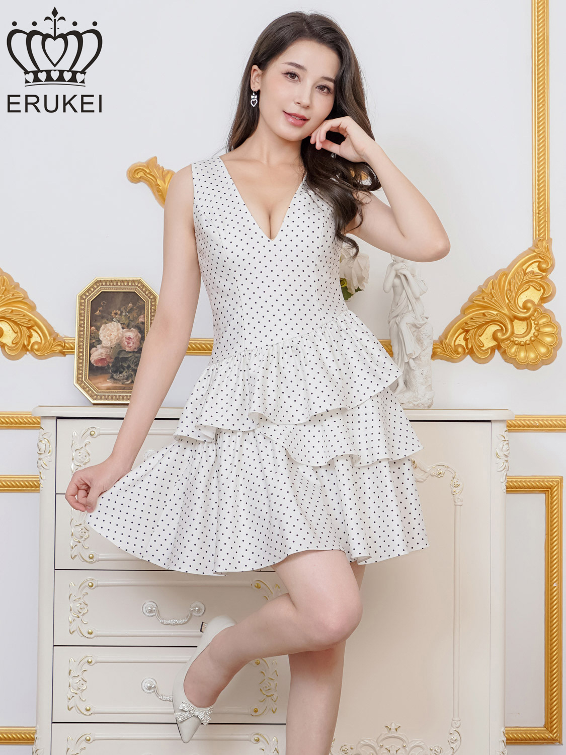 [送料無料][ERUKEI]ホワイト・ピンク・グリーン・ドット・プリント・ノースリーブ・Vネック・アシンメトリー・変形・ティアード・フレア・Aライン・ミニドレス・ワンピース[即日発送][大きいサイズあり]
