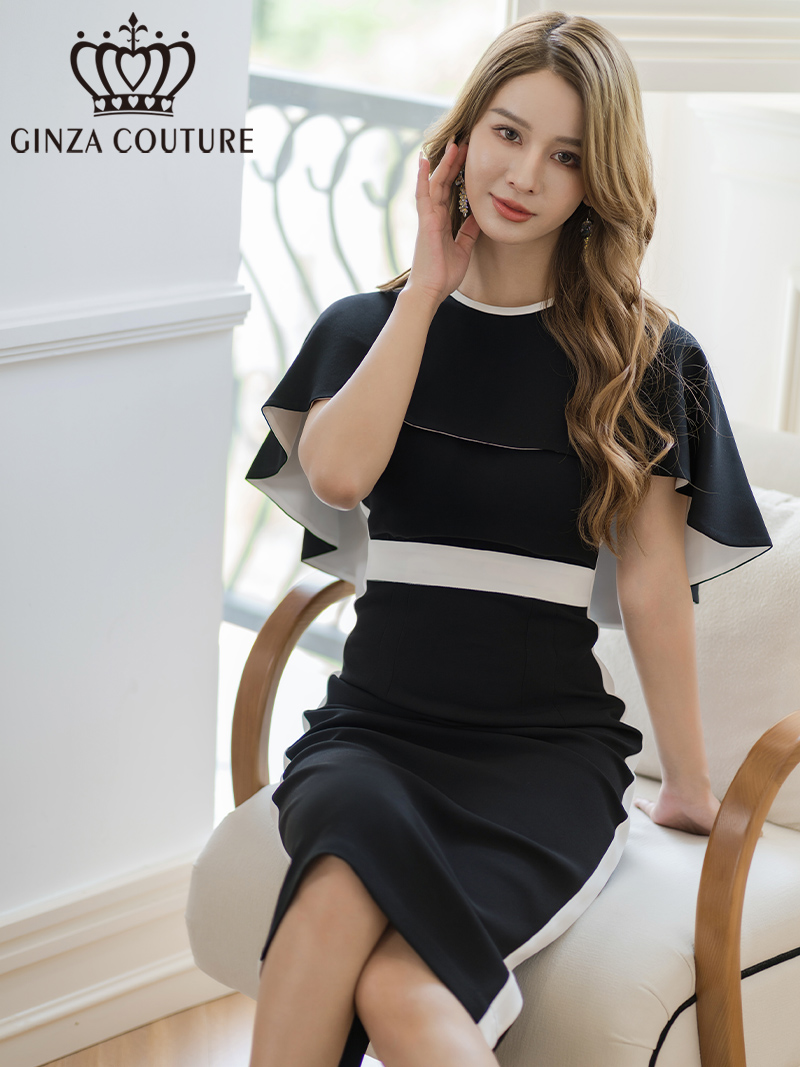 [送料無料][GINZA COUTURE]ブラック×ホワイト・ベージュ×ブラック・バイカラー・ケープ付き・切替・タイト・ミディアムドレス・ワンピース[即日発送][大きいサイズあり]