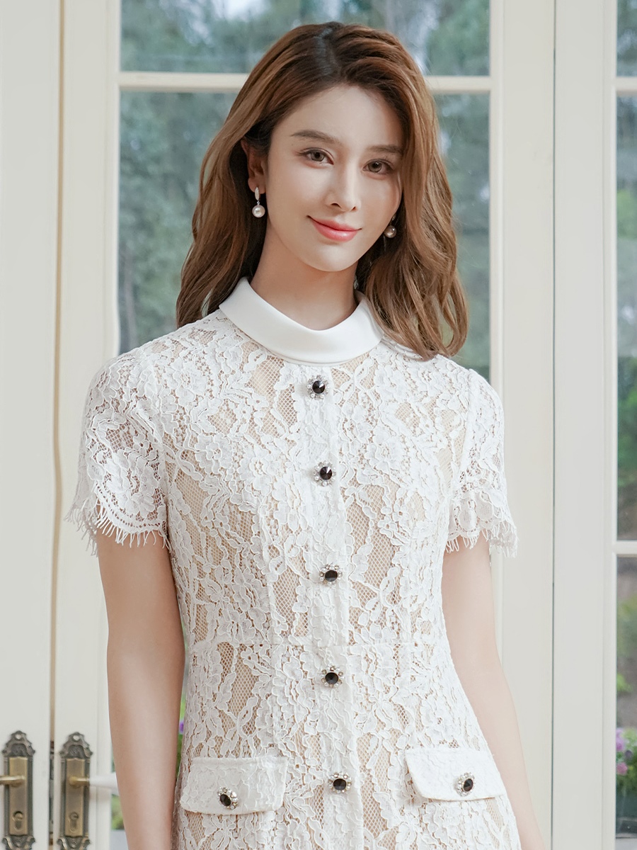 [送料無料][GINZA COUTURE]ホワイト・総レース・半袖・ロールカラー・ビジューボタン・フェイクポケット・タイト・ミディアムドレス・ワンピース[即日発送][大きいサイズあり]