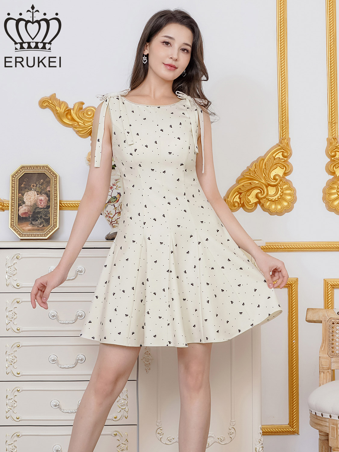 [送料無料][ERUKEI]アイボリー×ブラック・リボン柄・プリント・ノースリーブ・肩リボン・Aライン・フレア・ミニドレス・ワンピース[即日発送][大きいサイズあり]