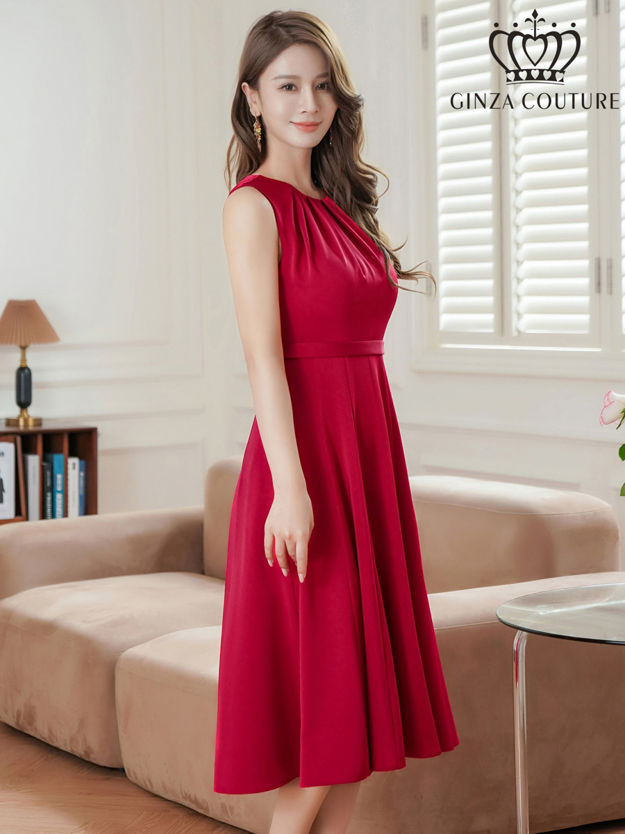 [送料無料][GINZA COUTURE]ワインレッド・ワンカラー・サテン・シンプル・ノースリーブ・切替・Aライン・フレア・ミディアムドレス・ワンピース[即日発送][大きいサイズあり] [C24090]