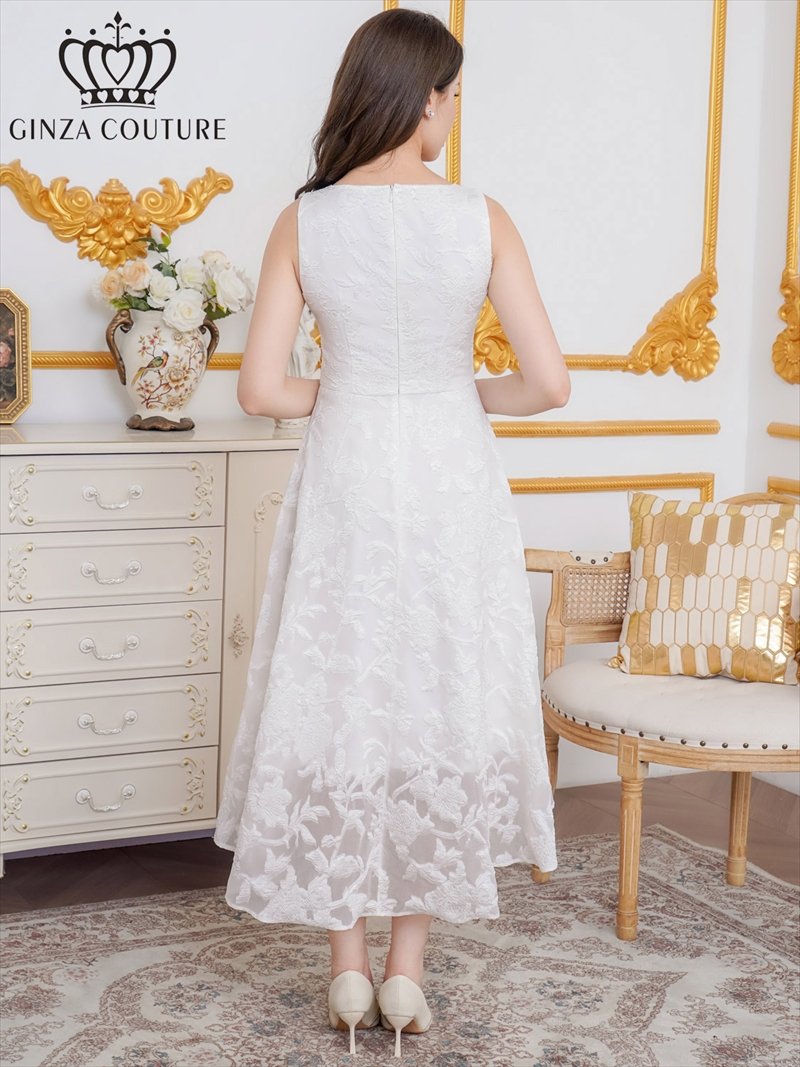 [送料無料][GINZA COUTURE]ブラック×ワインレッド・ホワイト・ジャガード・花柄・スリットネック・ノースリーブ・フィッシュテール・Aライン・ミディアムドレス・ワンピース[即日発送][大きいサイズあり]