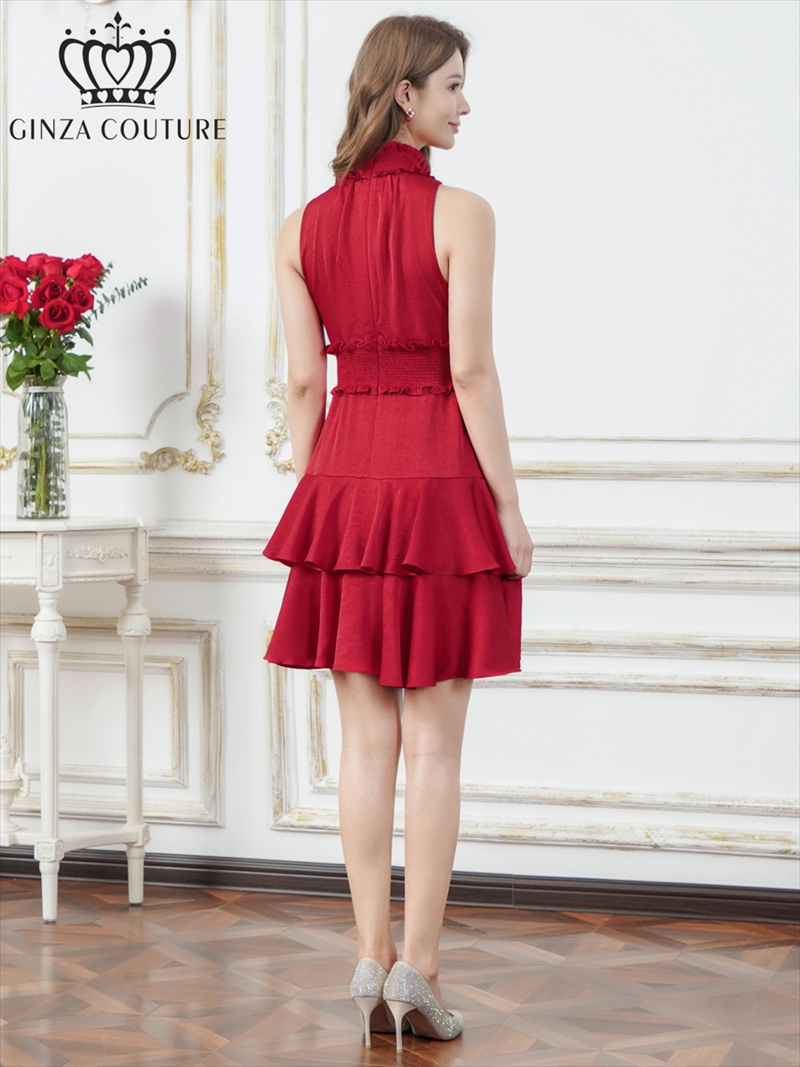 [送料無料][GINZA COUTURE]レッド・レッド×ホワイト・ホワイト・ブラック×ホワイト・ロイヤルブルー・ドット・花柄・プリント・ワンカラー・首元フリル・ウエストマーク・アメリカンスリーブ・ティアード・Aライン・ミニドレス・ワンピース[即日発送][大きいサイズあり] [C25129-2]