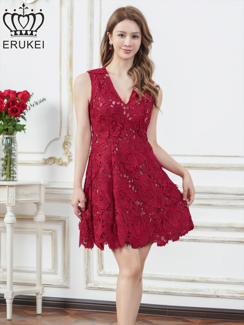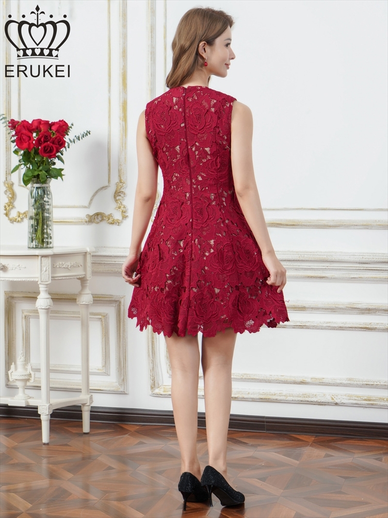 [送料無料][ERUKEI]ワインレッド・ホワイト・ブルー・総レース・ケミカルレース・ノースリーブ・Vネック・Aライン・ミニドレス・ワンピース[即日発送][大きいサイズあり] [E25188-2]