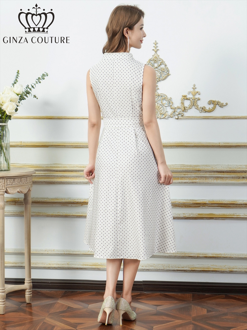 [送料無料][GINZA COUTURE]ホワイト・グリーン・ドット・金ボタン・ポケット・リボンベルト・ノースリーブ・Aライン・ミディアムドレス・ワンピース[即日発送][大きいサイズあり]