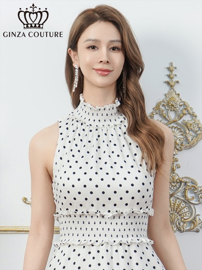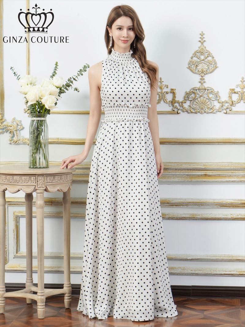 [送料無料][GINZA COUTURE]レッド×ホワイト・ホワイト×ブラック・ドット・首元フリル・ウエストマーク・マキシ・アメリカンスリーブ・Aライン・ロングドレス[即日発送][大きいサイズあり]