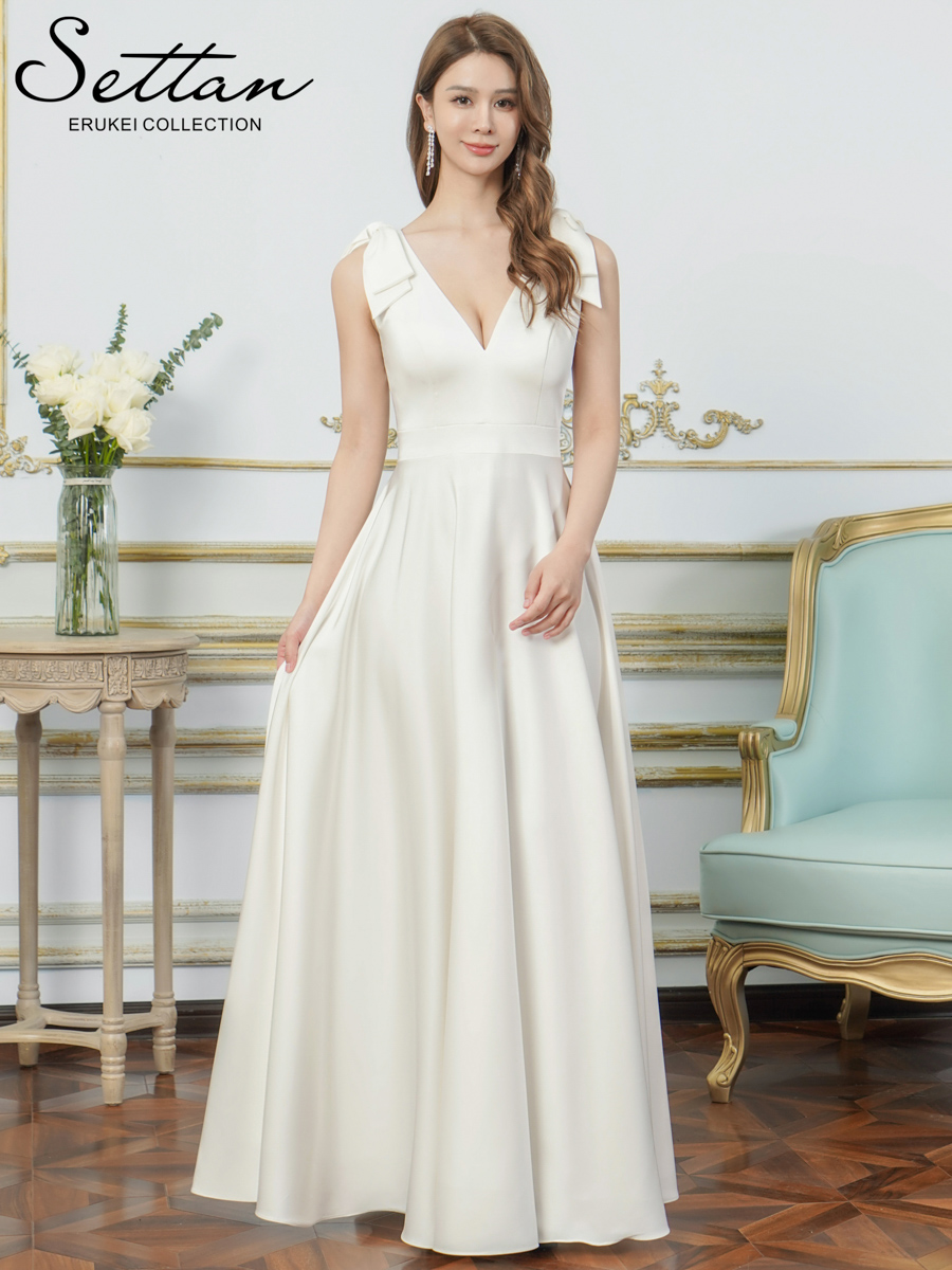 [送料無料][SETTAN]ホワイト・ライトピンク・オレンジ・ベージュ×プリント・Vネック・ノースリーブ・シンプル・サテン・上品・肩リボン・切替・Aライン・ロングドレス[即日発送][大きいサイズあり] [S25158-1]