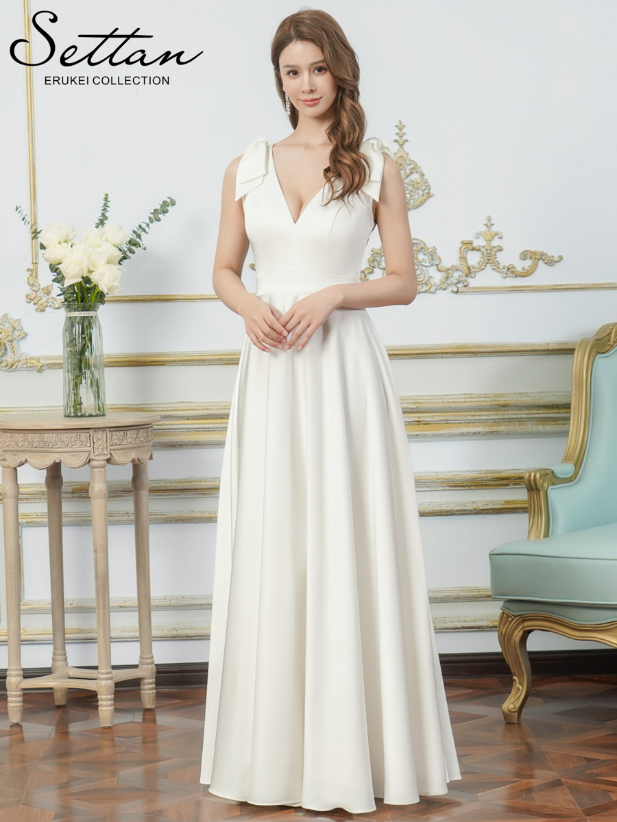 [送料無料][SETTAN]ホワイト・ライトピンク・オレンジ・ベージュ×プリント・Vネック・ノースリーブ・シンプル・サテン・上品・肩リボン・切替・Aライン・ロングドレス[即日発送][大きいサイズあり]