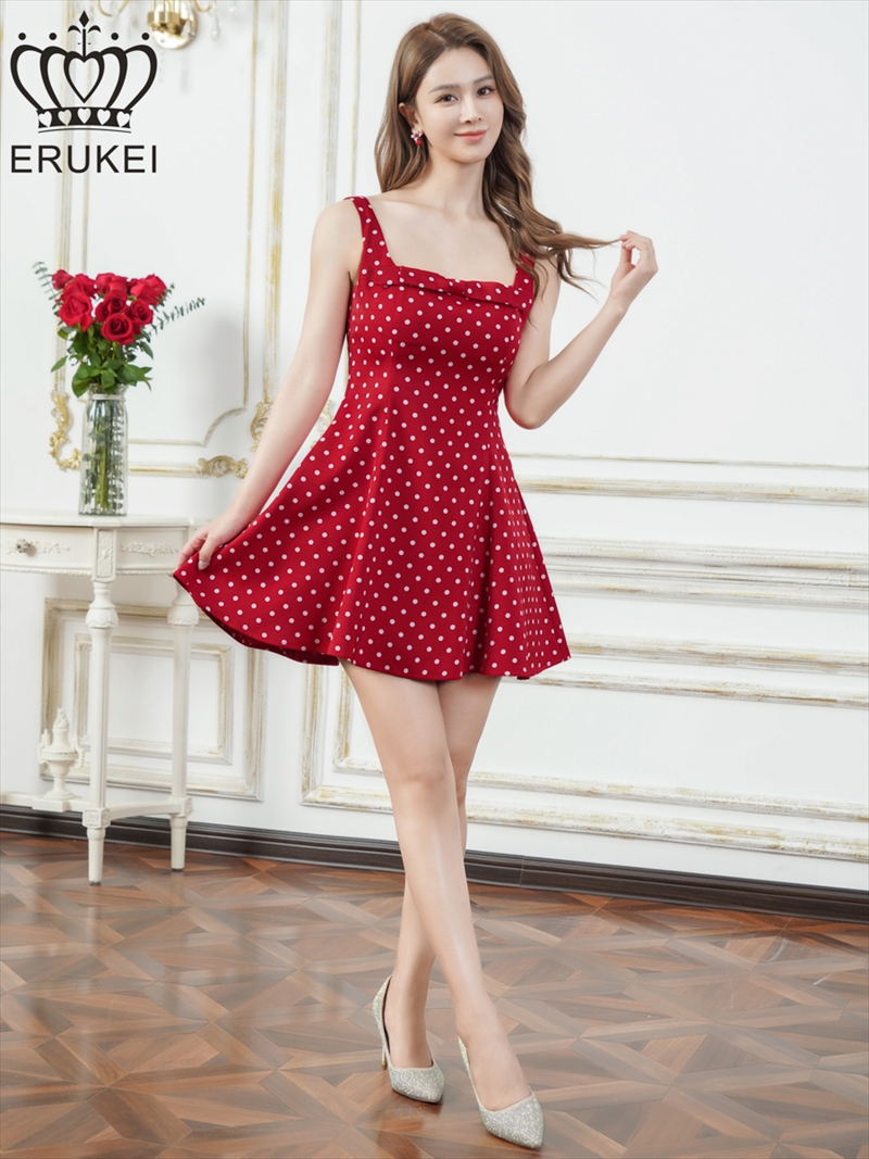[送料無料][ERUKEI]アンゴラレッド・レッド×ホワイト・アイボリー×ブラック・ピンク×ブラック・ネイビー×ホワイト・ドット・ワンカラー・サテン・ノースリーブ・リボン・フレア・Aライン・ミニドレス・ワンピース[即日発送][大きいサイズあり] [E25103-1]