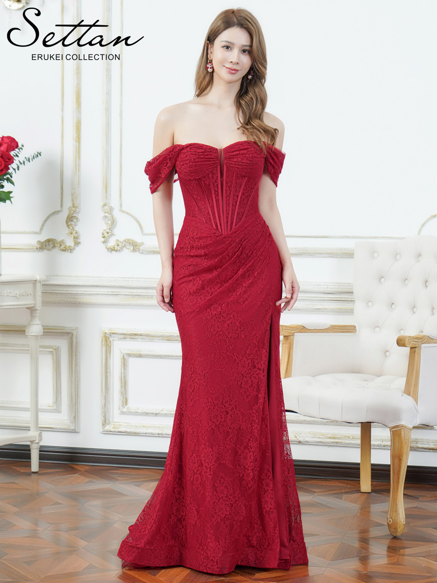[送料無料][SETTAN]レッド・ホワイト・総レース・オフショルダー・コルセット風・スピンドル・シアー・ギャザー・スリット・タイト・マーメイド・ロングドレス[即日発送][大きいサイズあり] [S37220]