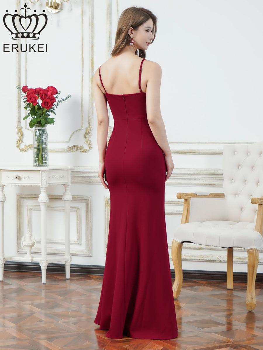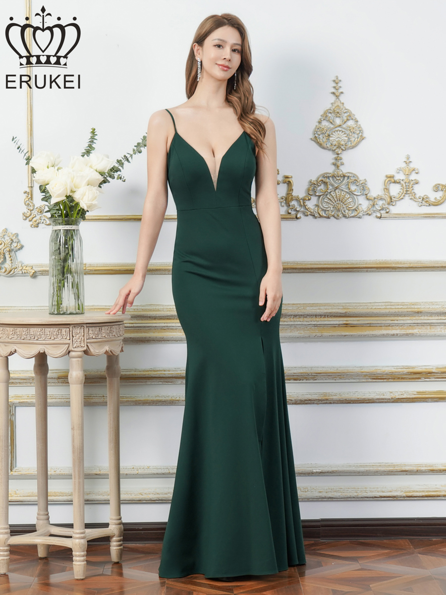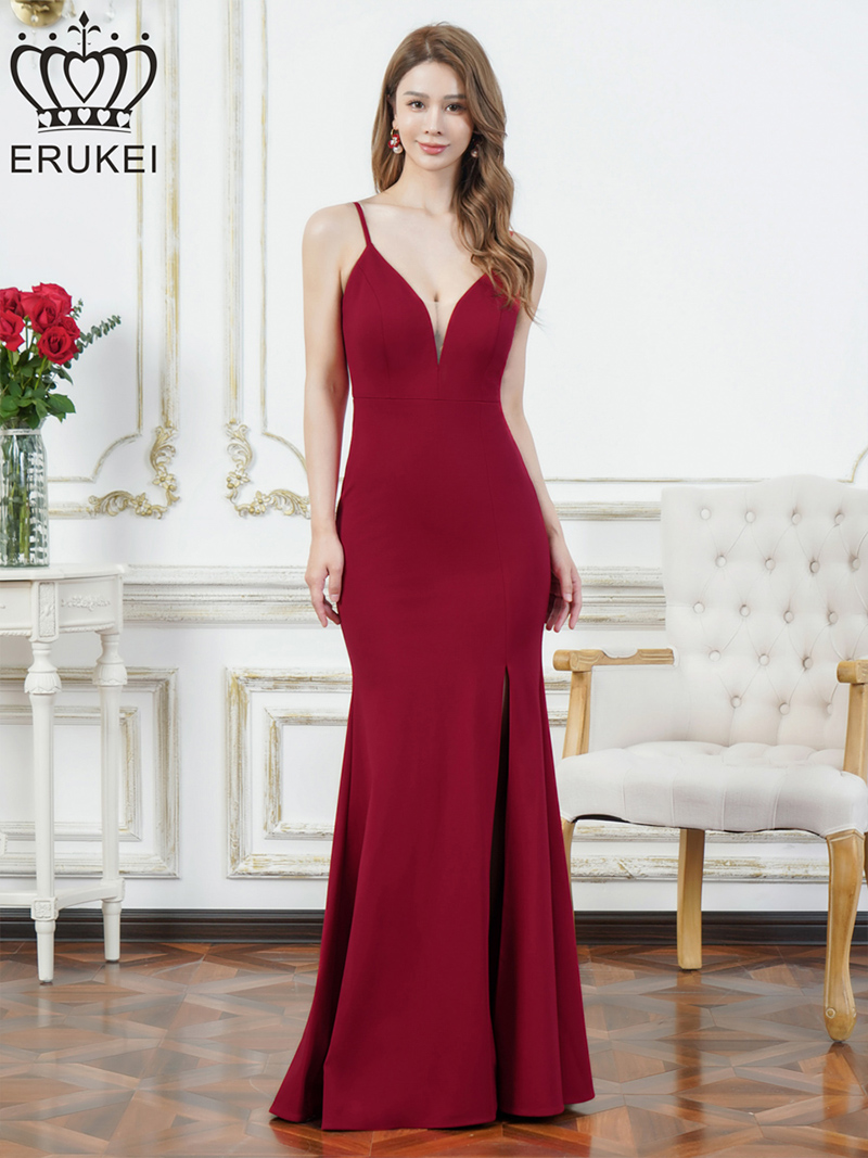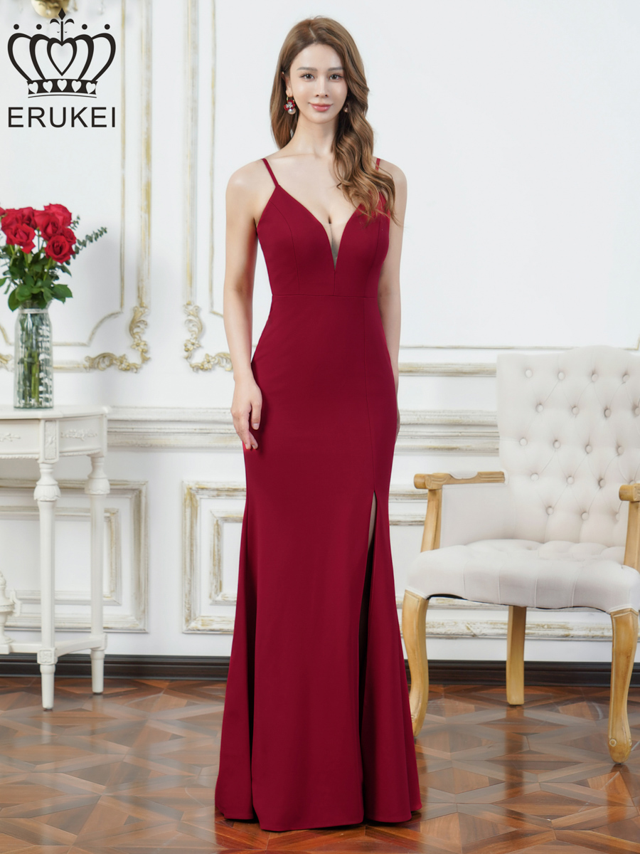 [送料無料][ERUKEI]ワインレッド・ホワイト・グリーン・マスタード・ネイビー・ワンカラー・シンプル・キャミソール・Vカット・シアー・スリット・タイト・マーメイド・ロングドレス[即日発送][大きいサイズあり] [E25205]