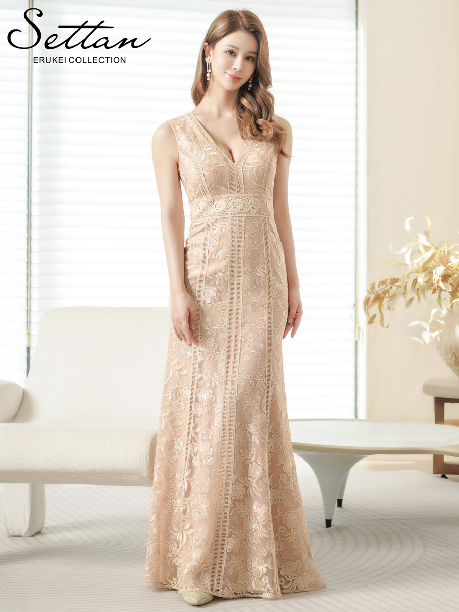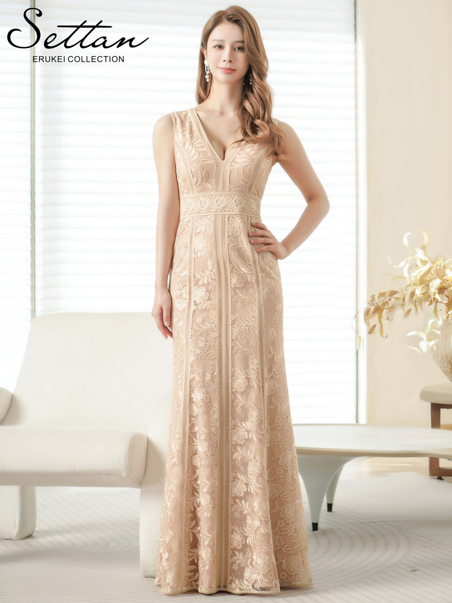 [送料無料][SETTAN]ベージュ・レッド・ホワイト・総レース・ノースリーブ・Vネック・ハイウエスト・タイト・マーメイド・ロングドレス[即日発送][大きいサイズあり] [S25338-1]