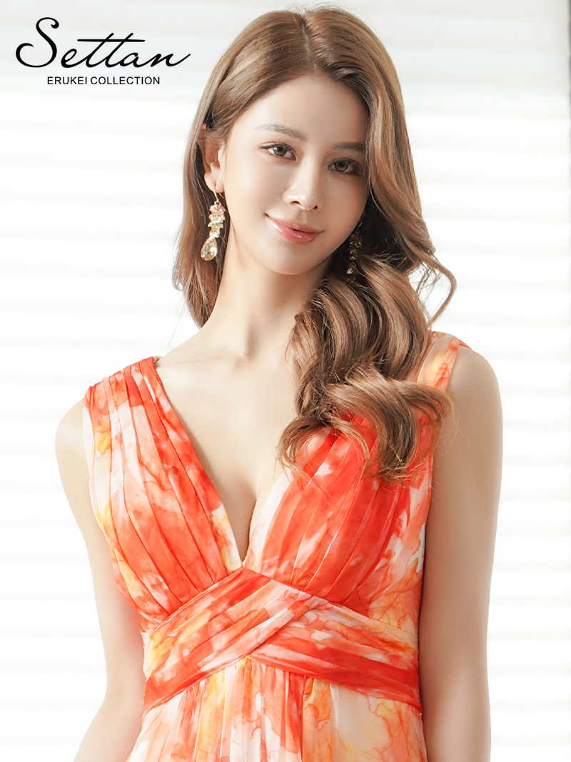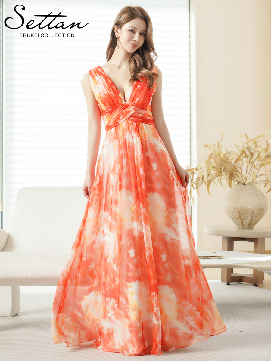 [送料無料][SETTAN]オレンジ・ブルー・シフォン・滲み・プリント・ギャザー・ノースリーブ・Vネック・Aライン・ロングドレス[即日発送][大きいサイズあり]