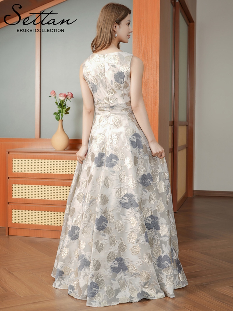 [送料無料][SETTAN]ゴールド×グレー・ノースリーブ・ラウンドネック・花柄・フラワー・フレア・Aライン・ロングドレス[即日発送][大きいサイズあり]