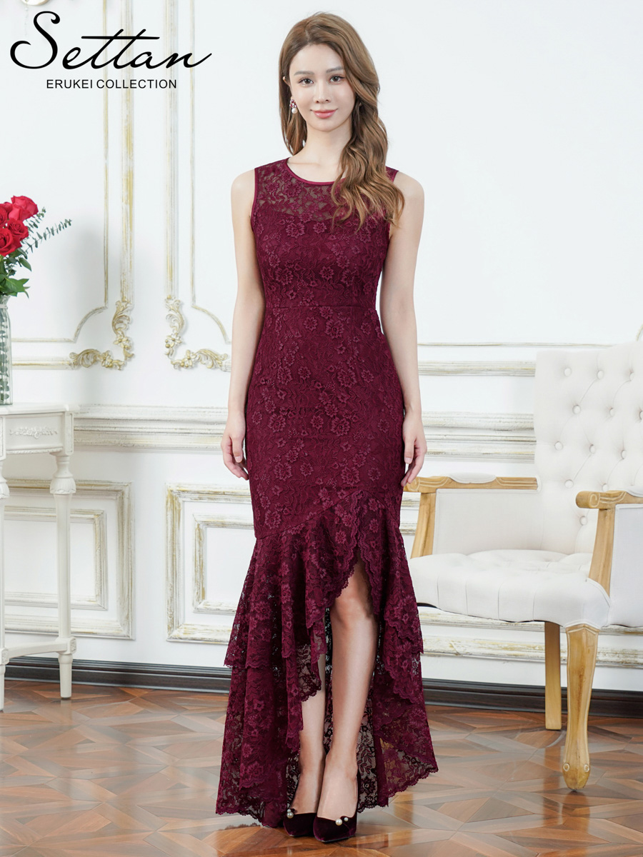 [送料無料][SETTAN]ワインレッド・総レース・シアー・ノースリーブ・エレガント・スリット・変形ヘム・フィッシュテール・タイト・マーメイド・ロングドレス[即日発送][大きいサイズあり] [S25332]