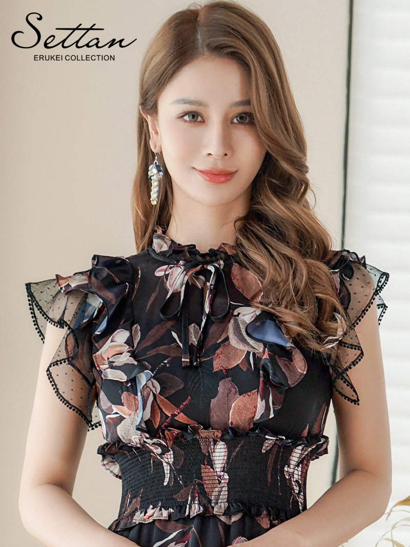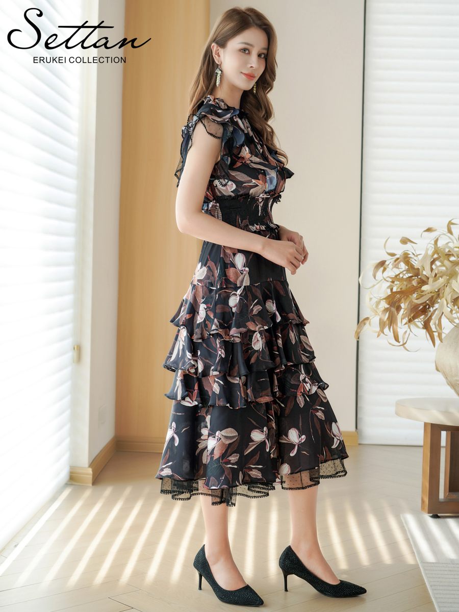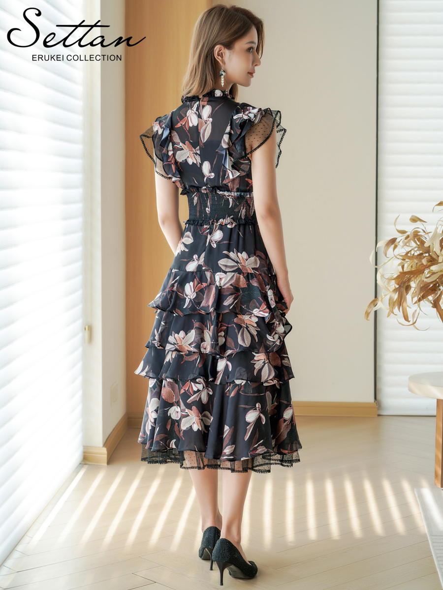 [送料無料][SETTAN]ブラック×ブラウン・花柄・シフォン・フリルスリーブ・プチハイネック・ティアード・Aライン・ミディアムドレス・ワンピース[即日発送][大きいサイズあり]