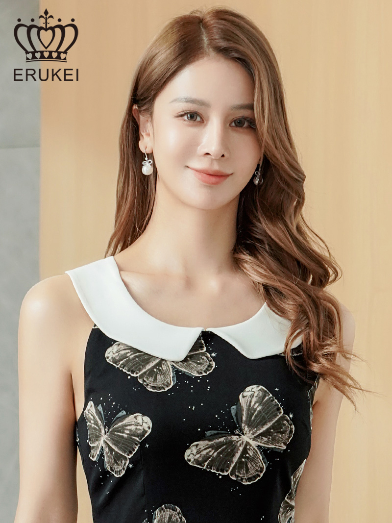 [送料無料][ERUKEI]ブラック×ホワイト・バタフライ柄・プリント・ローカラー・襟付き・アメリカンスリーブ・ティアード・Aライン・ミニドレス・ワンピース[即日発送][大きいサイズあり]