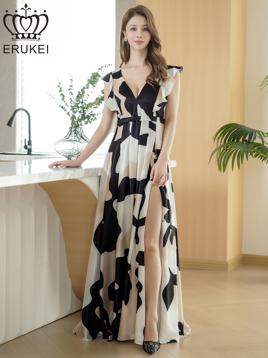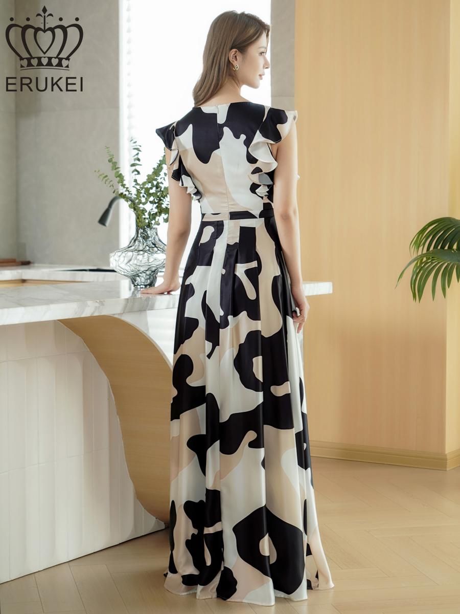 [送料無料][ERUKEI]ブラック×ホワイト・抽象柄・プリント・サテン・フリルスリーブ・Vネック・タック・ベルト風・スリット・Aライン・ロングドレス[即日発送][大きいサイズあり] [E25285]