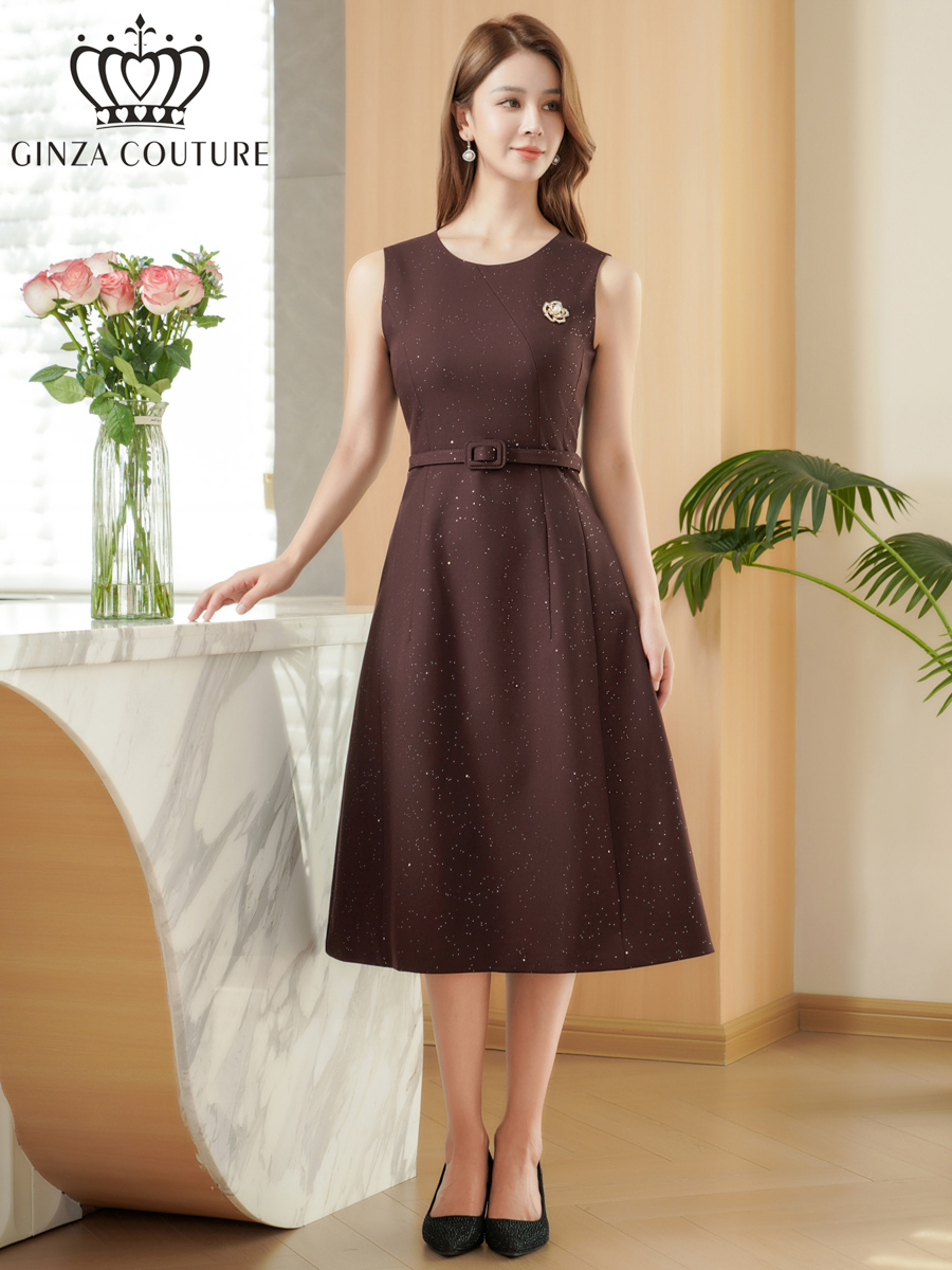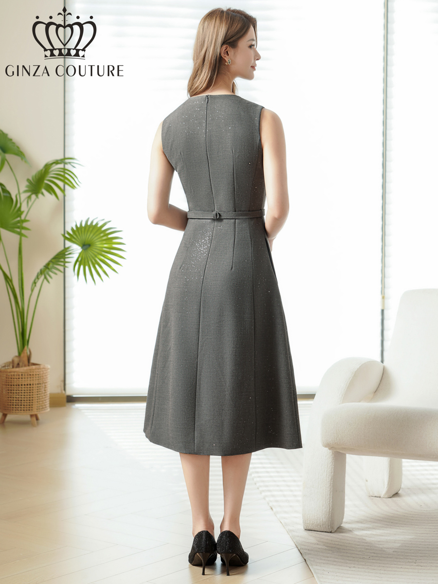 [送料無料][GINZA COUTURE]グレー・ワインレッド・ワンカラー・ラメ・シンプル・ブローチ・ベルト・ノースリーブ・Aライン・ミディアムドレス・ワンピース[即日発送][大きいサイズあり]