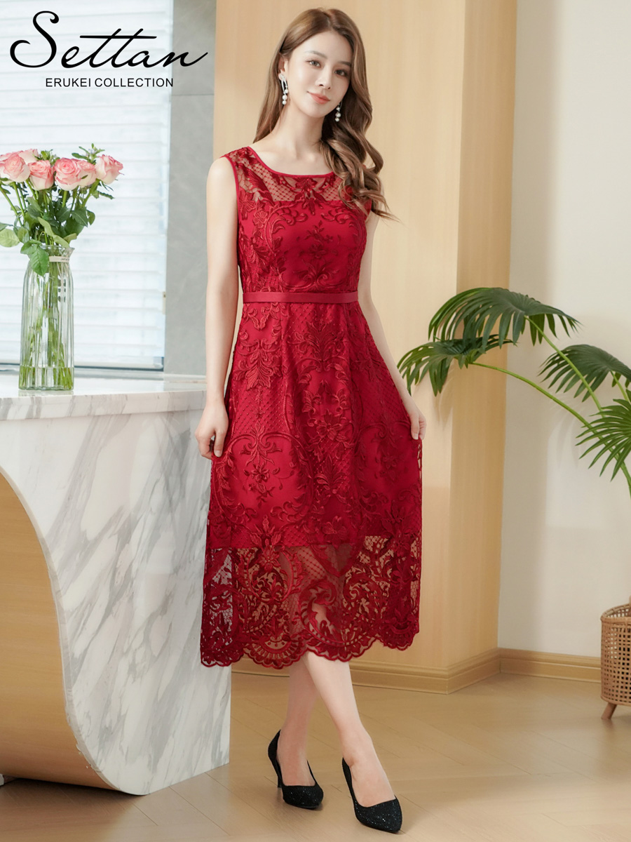 [送料無料][SETTAN]レッド・ブラック・レース・シアー・スカラップ・ノースリーブ・Aライン・ミディアムドレス・ワンピース[即日発送][大きいサイズあり]