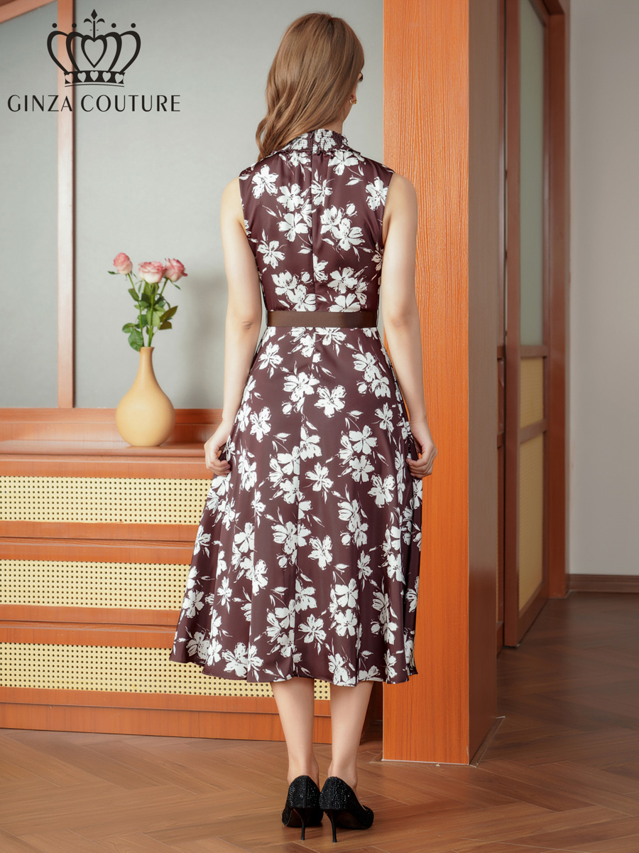 [送料無料][GINZA COUTURE]ブラウン×ホワイト・花柄・プリント・ハイネック・ベルト・Aライン・ミディアムドレス・ワンピース[即日発送][大きいサイズあり]