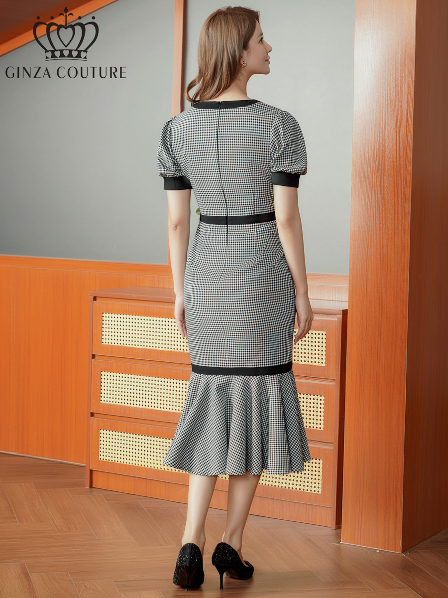 [送料無料][GINZA COUTURE]ブラック×ホワイト・千鳥格子柄・パフスリーブ・半袖・タイト・マーメイド・ミディアムドレス・ワンピース[即日発送][大きいサイズあり]