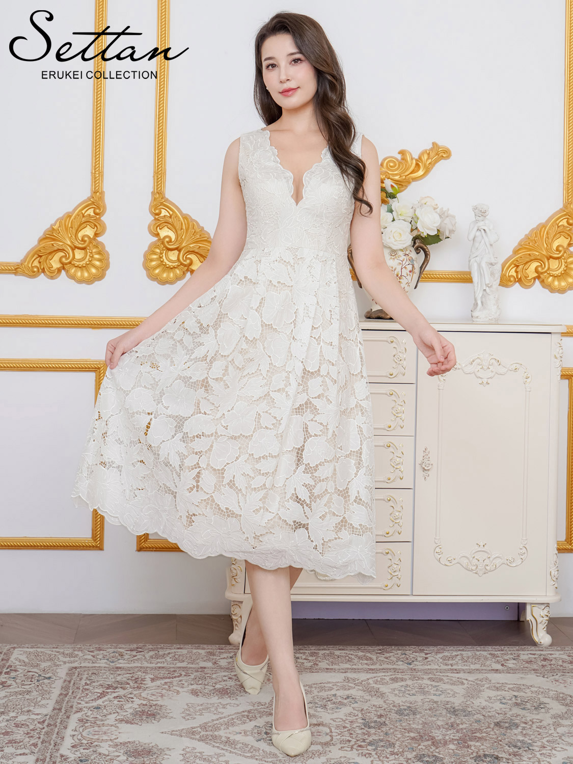 [送料無料][SETTAN]ホワイト・総レース・Vネック・ノースリーブ・Aライン・ミディアムドレス・ワンピース[即日発送][大きいサイズあり]