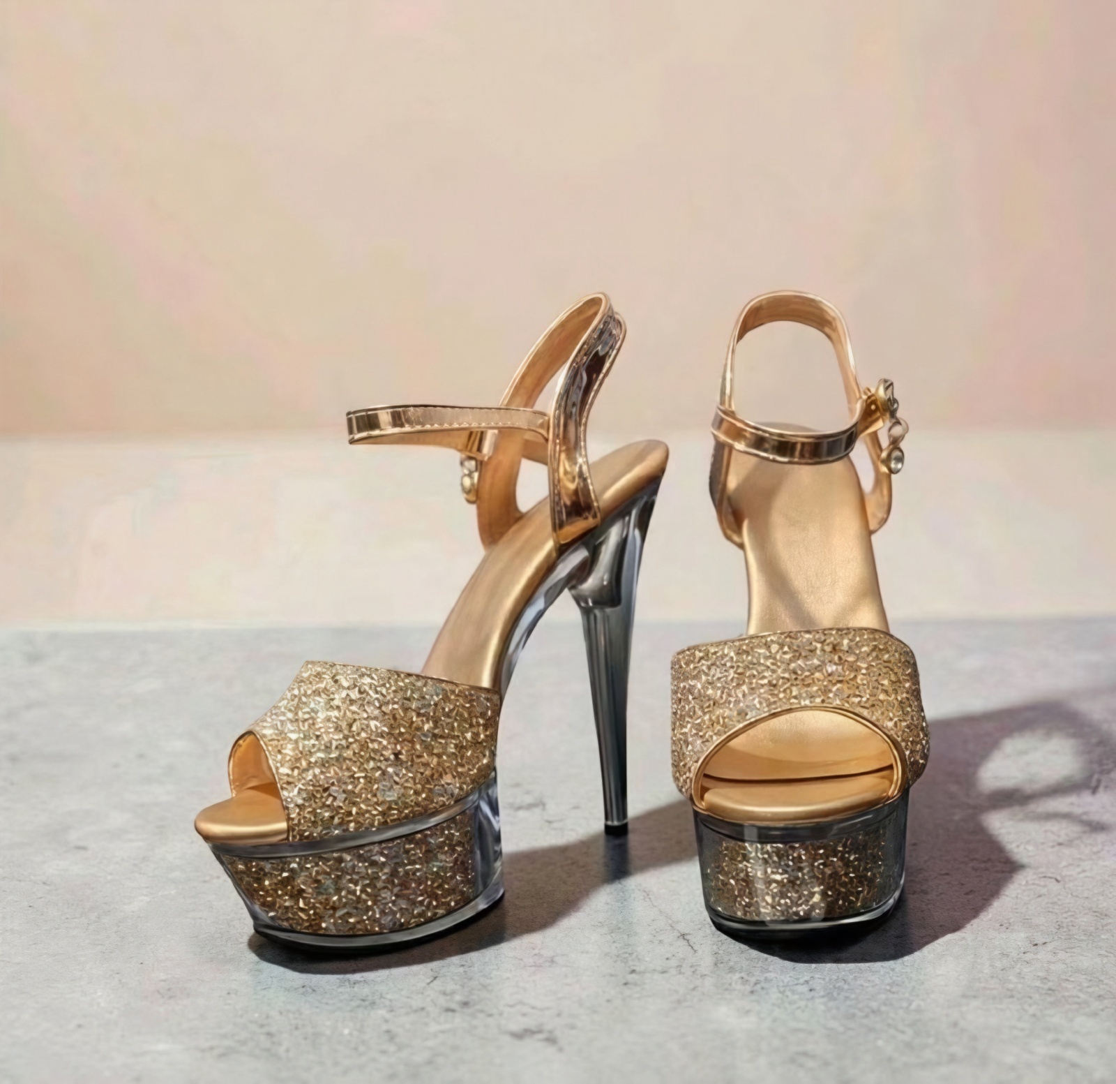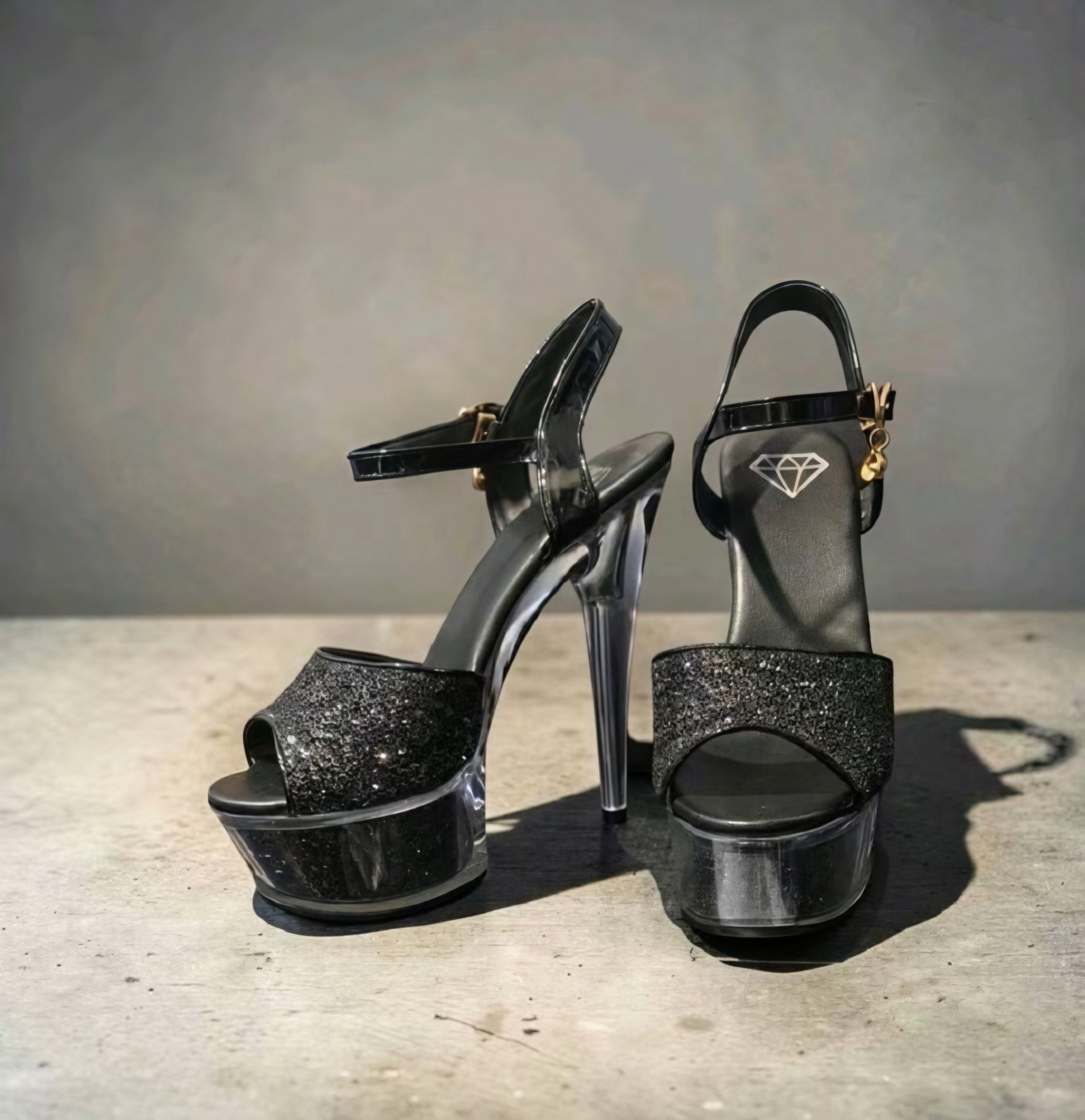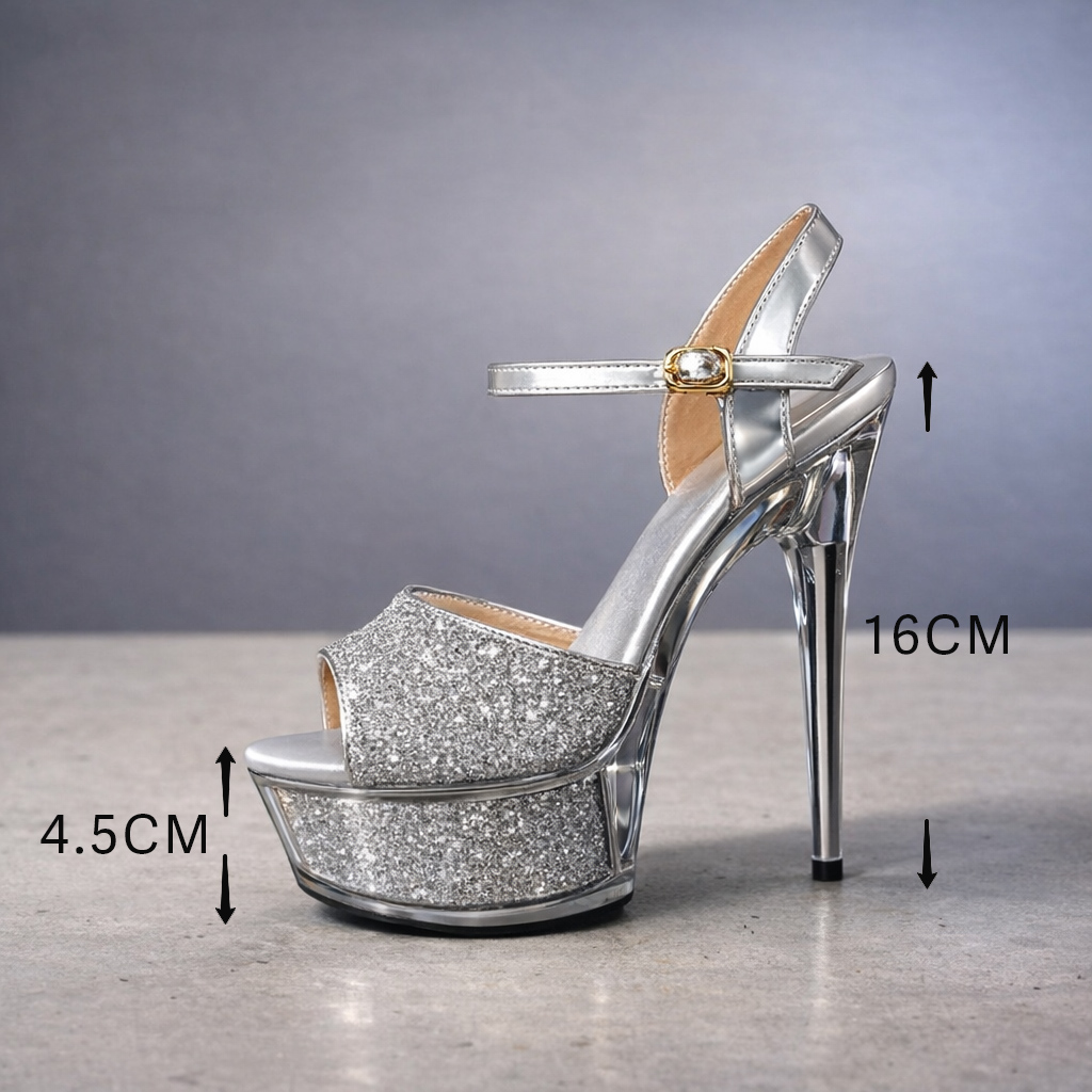 [ニュースソース][news]シルバー・ピンクゴールド・ブラック・アンクルストラップ・ラメ・グリッター・ラインストーンチャーム・厚底・16cmヒール・サンダル[即日発送]