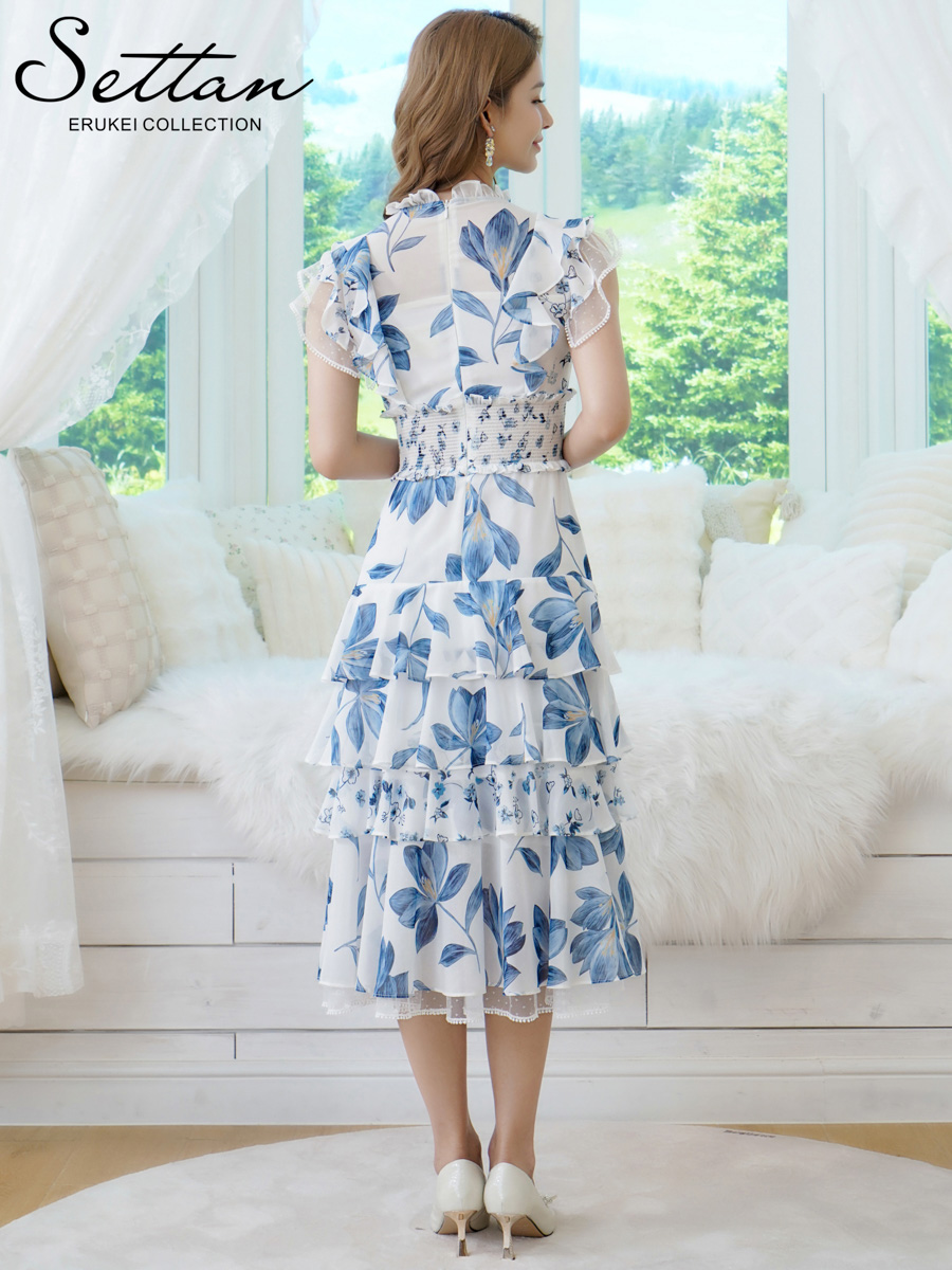 [送料無料][SETTAN]ホワイト×ブルー・ブラック×ブルー・花柄・プリント・シフォン・プチハイネック・フリルスリーブ・ティアード・Aライン・ミディアムドレス・ワンピース[即日発送][大きいサイズあり]