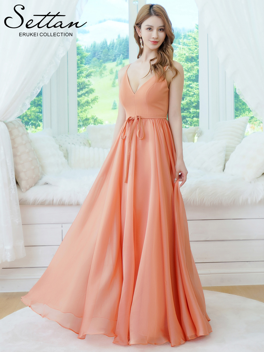 [送料無料][SETTAN]オレンジ・アンゴラレッド・グリーン・ホワイト・シフォン・ワンカラー・キャミソール・リボンベルト・Aライン・フレア・ロングドレス[即日発送][大きいサイズあり]