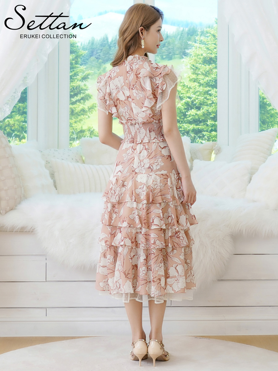 [送料無料][SETTAN]ピンク×アイボリー・花柄・シフォン・フリルスリーブ・プチハイネック・ティアード・Aライン・ミディアムドレス・ワンピース[即日発送][大きいサイズあり]
