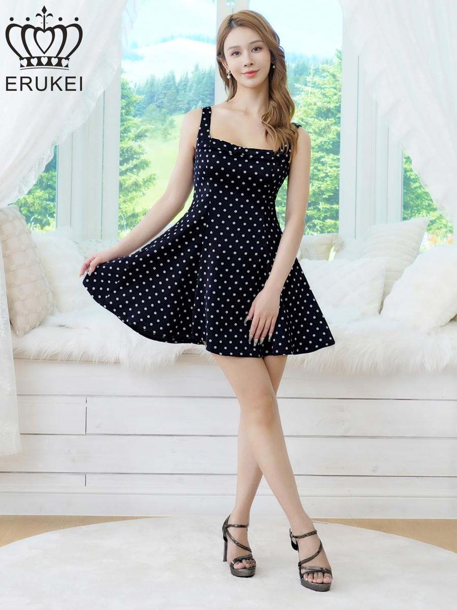[送料無料][ERUKEI]ネイビー×ホワイト・レッド×ホワイト・アンゴラレッド・アイボリー×ブラック・ピンク×ブラック・ドット・ワンカラー・サテン・ノースリーブ・リボン・フレア・Aライン・ミニドレス・ワンピース[即日発送][大きいサイズあり] [E25103-3]