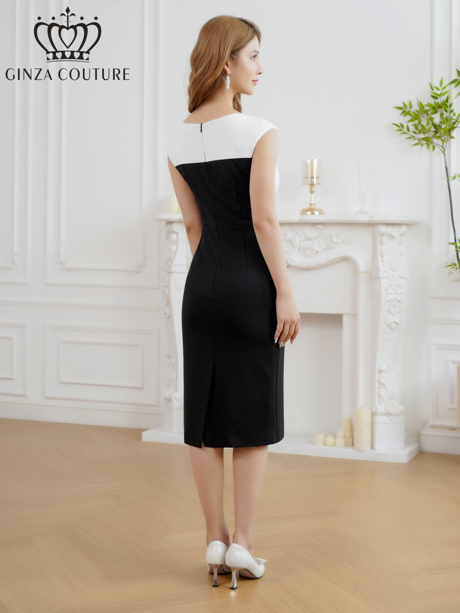 [送料無料][GINZA COUTURE]ホワイト×ブラック・バイカラー・バストギャザー・Vネック・バックスリット・ストレッチ・シンプル・ノースリーブ・タイト・膝丈・ミディアムドレス・ワンピース[即日発送][大きいサイズあり]