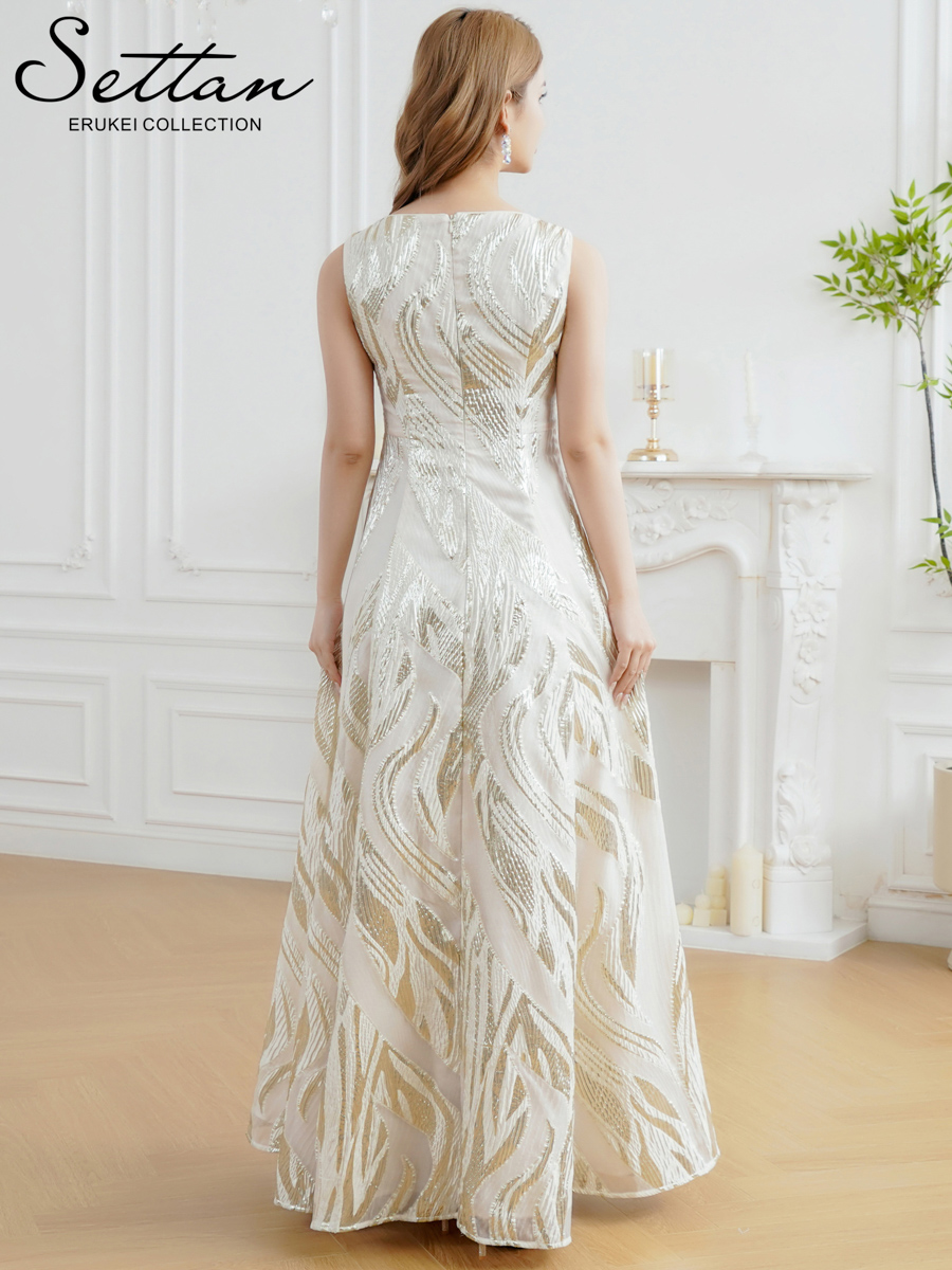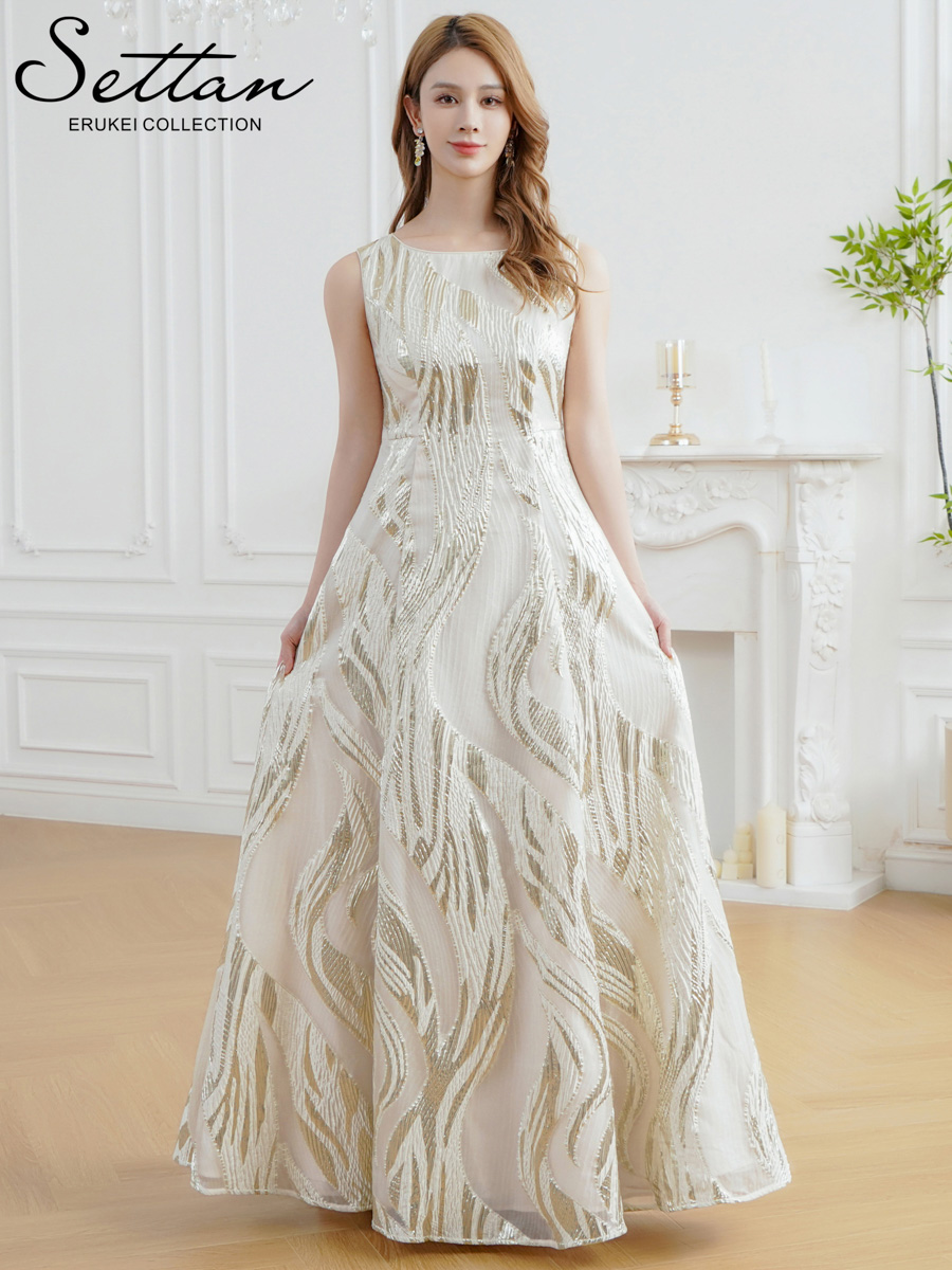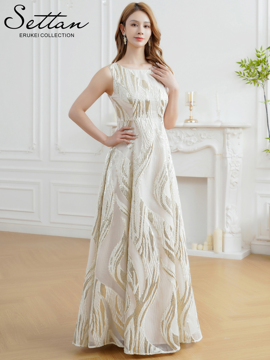 [送料無料][SETTAN]アイボリー・ゴールド×ブルー・ゴールド×ピンク・金糸・柄物・オーガンジー・ボートネック・ノースリーブ・Aライン・フレア・ロングドレス[即日発送][大きいサイズあり]
