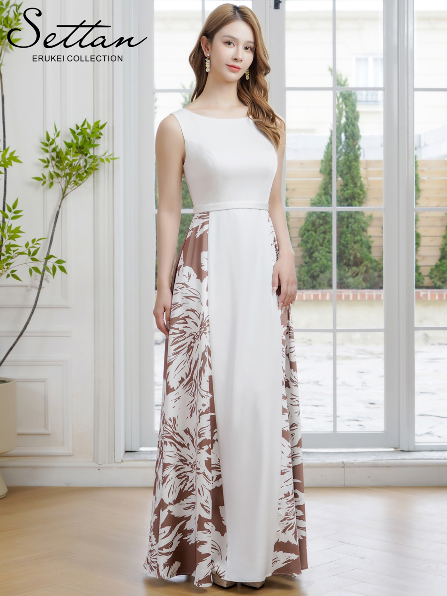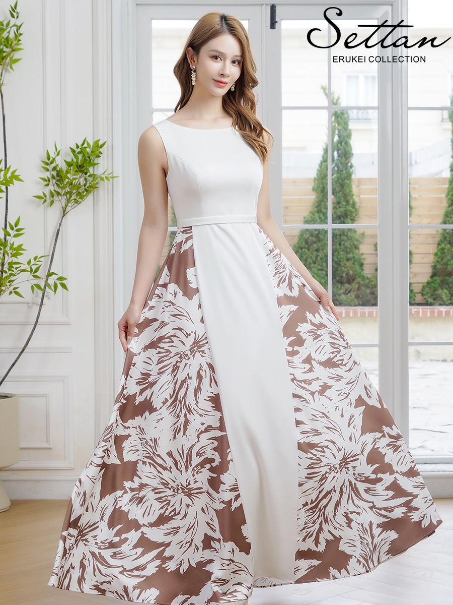[送料無料][SETTAN]ホワイト×ブラウン・ノースリーブ・バイカラー・花柄・切替・ハイウエスト・フレア・Aライン・ロングドレス[即日発送][大きいサイズあり]