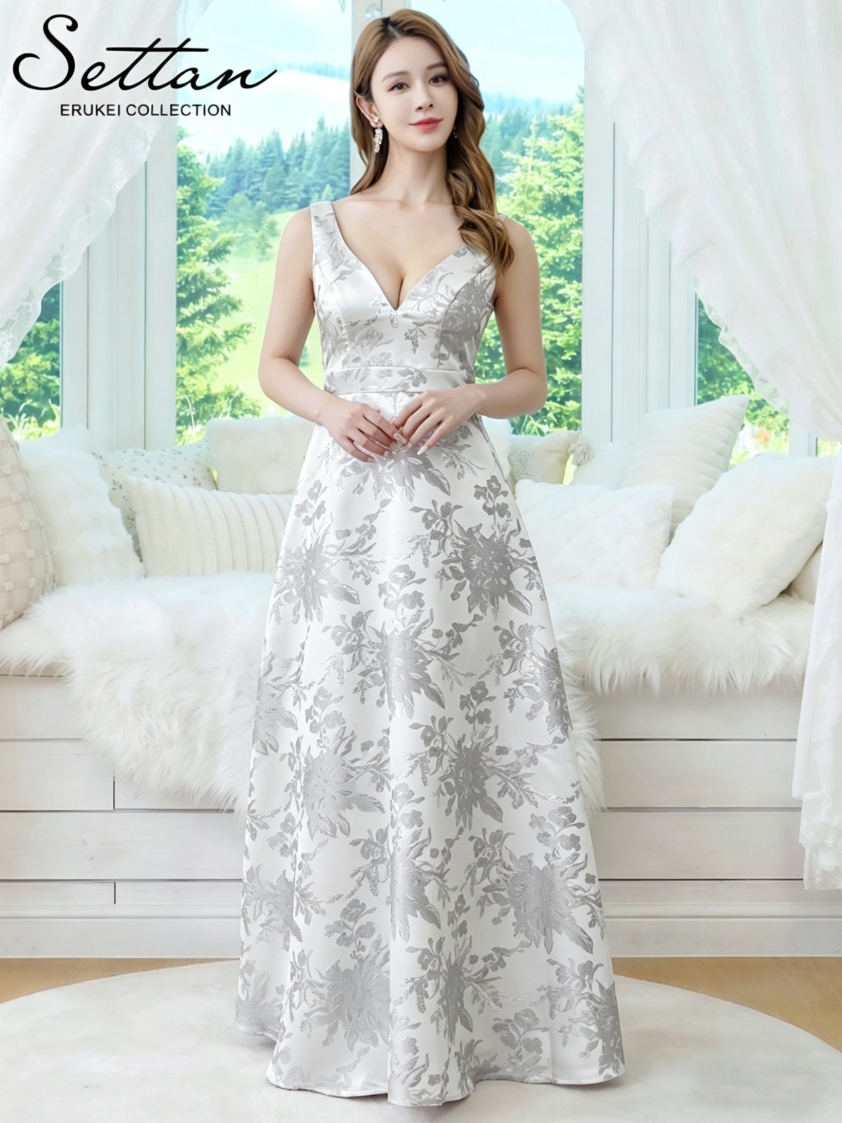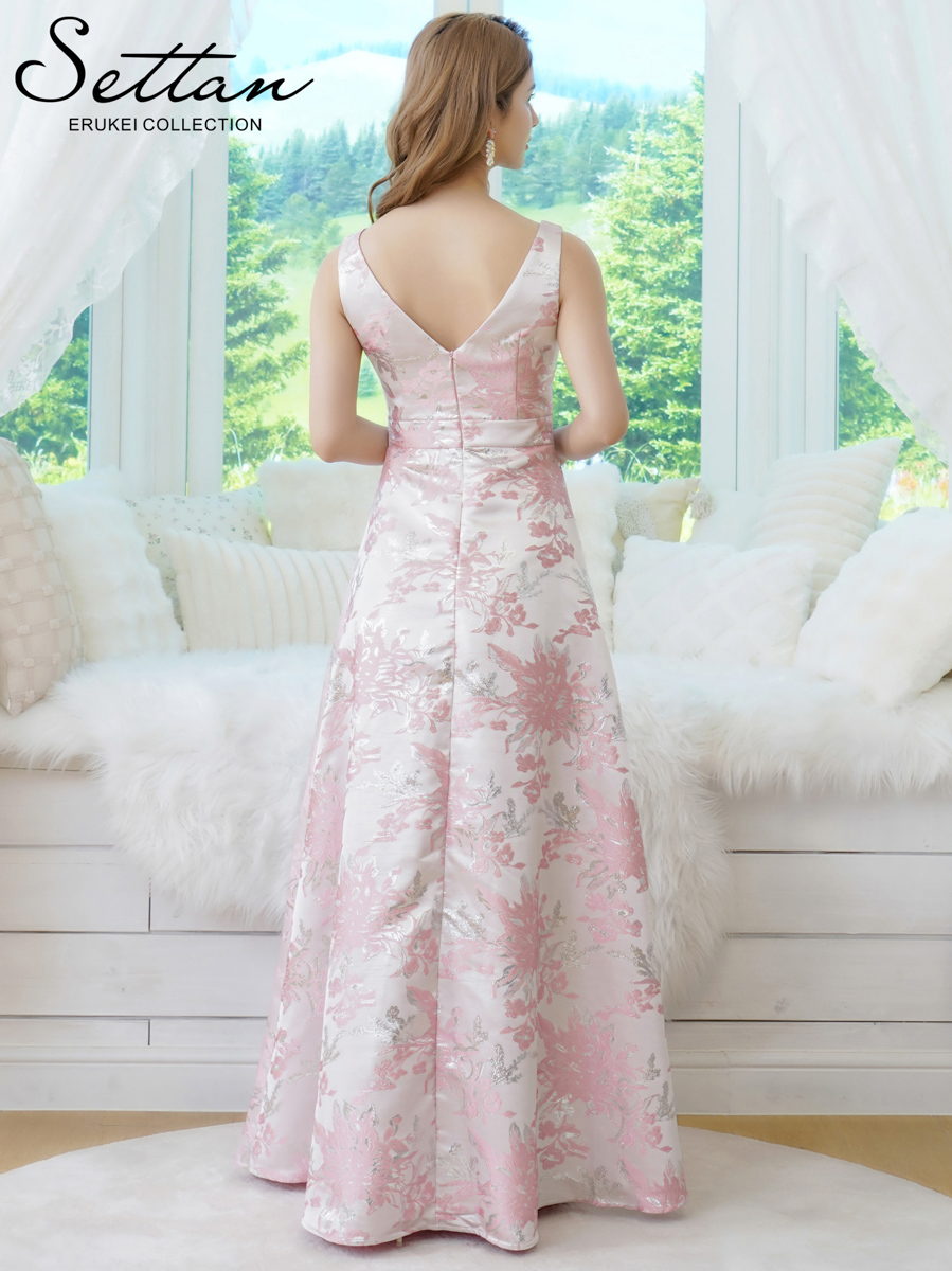 [送料無料][SETTAN]ピンク・ブラック・グレー・ジャガード・花柄・金糸・Vネック・ハイウエスト・ノースリーブ・フレア・Aライン・ロングドレス[即日発送][大きいサイズあり]