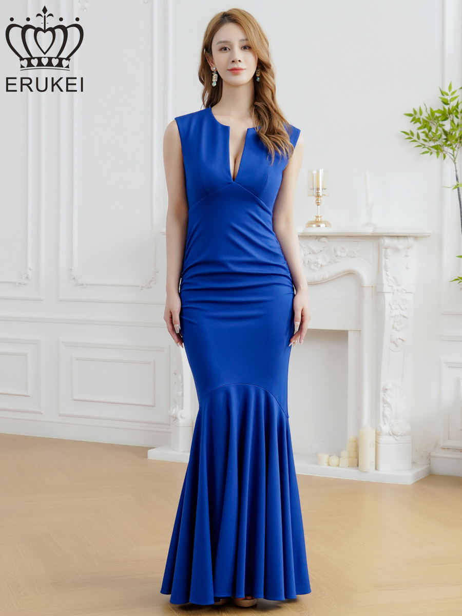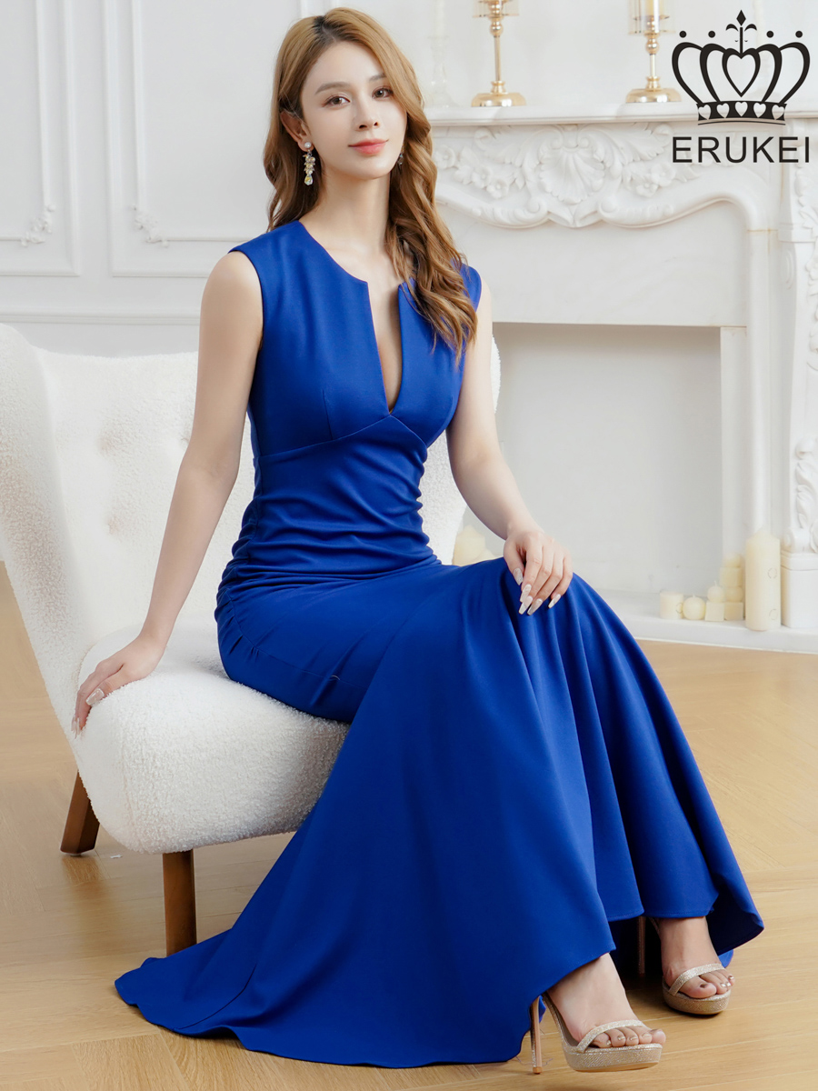 [送料無料][ERUKEI]ロイヤルブルー・ホワイト・ネイビー・ワンカラー・シンプル・胸元スリットカット・ノースリーブ・ストレッチ・タイト・マーメイド・ロングドレス[即日発送][大きいサイズあり] [E25191]