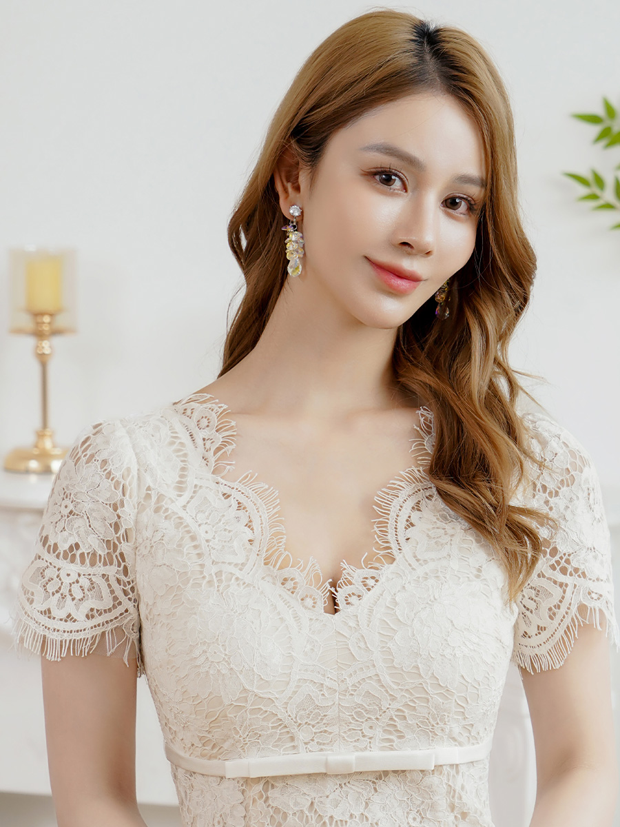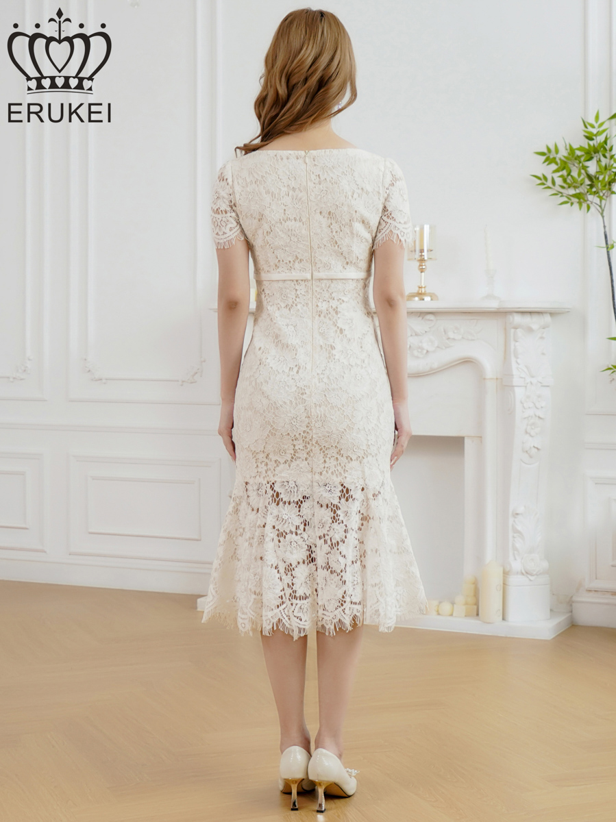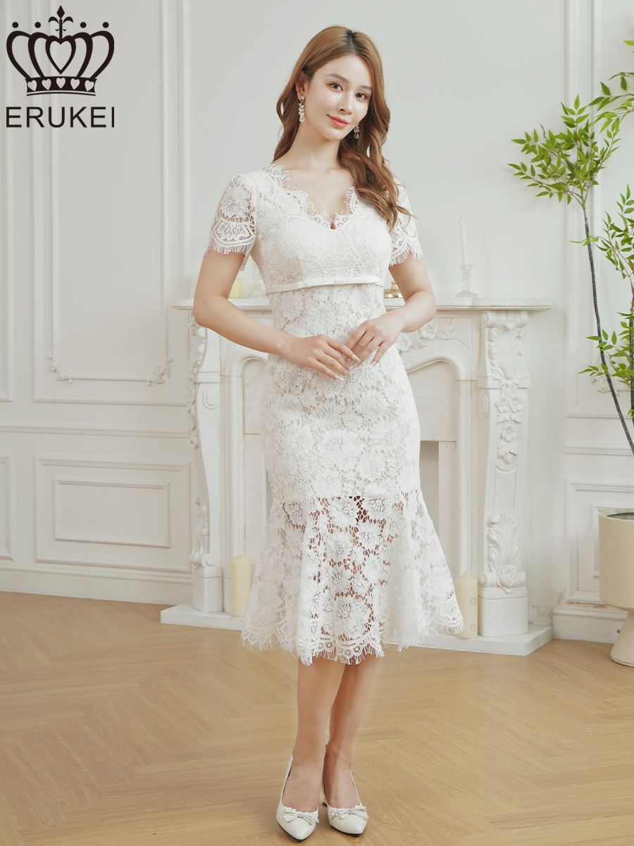 [ERUKEI]ホワイト・レッド・ワンカラー・総レース・フリンジ・半袖・インナーミニ・タイト・マーメイド・ミディアムドレス・ワンピース[即日発送][大きいサイズあり] [E25294]