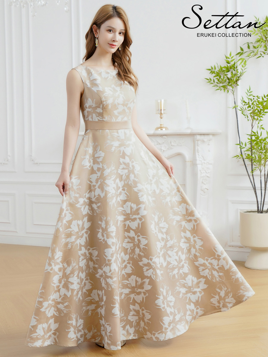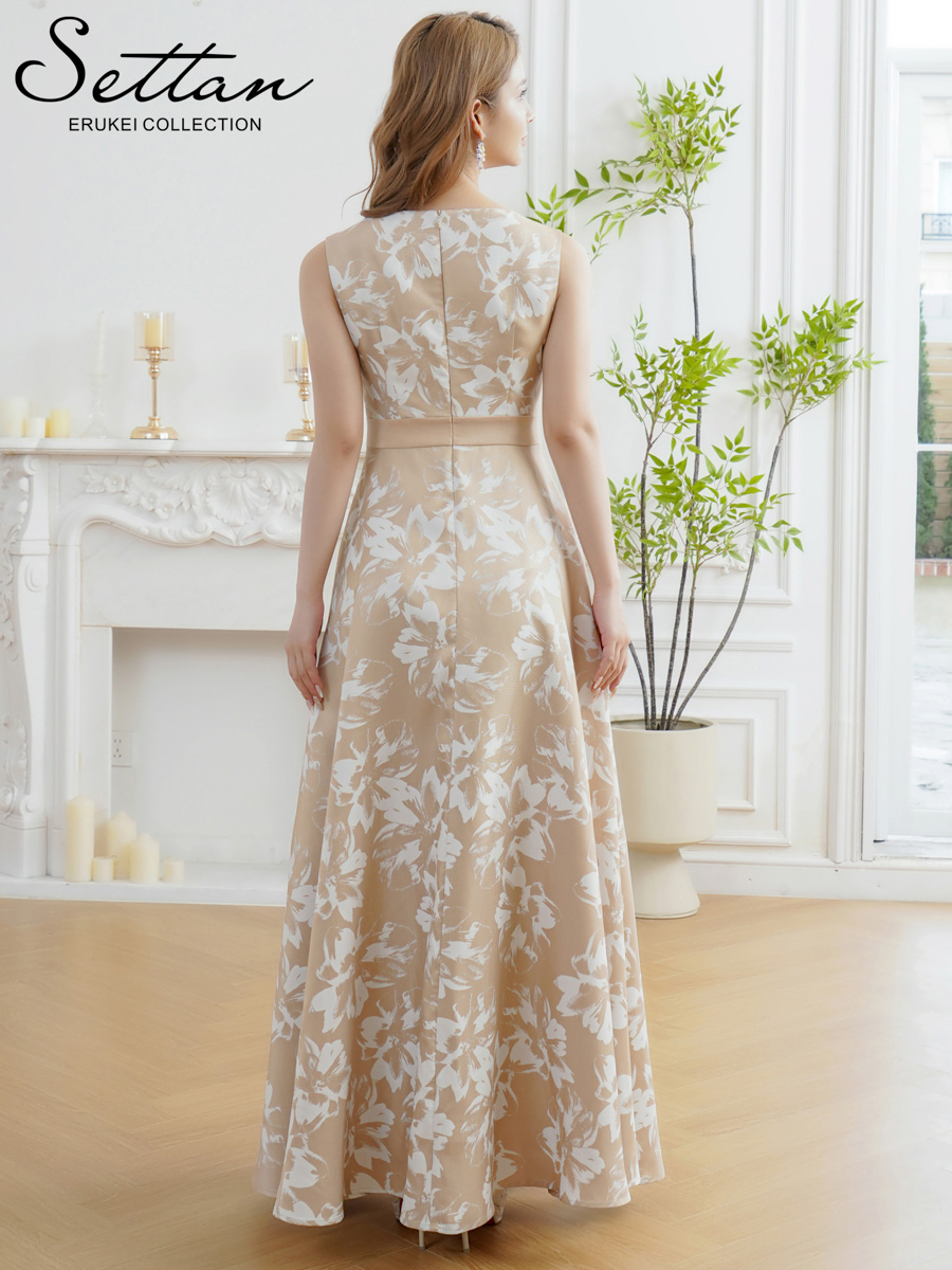 [送料無料][SETTAN]ベージュ・フラワープリント・花柄・ハイウエスト・ノースリーブ・ボートネック・Aライン・ロングドレス[即日発送][大きいサイズあり]