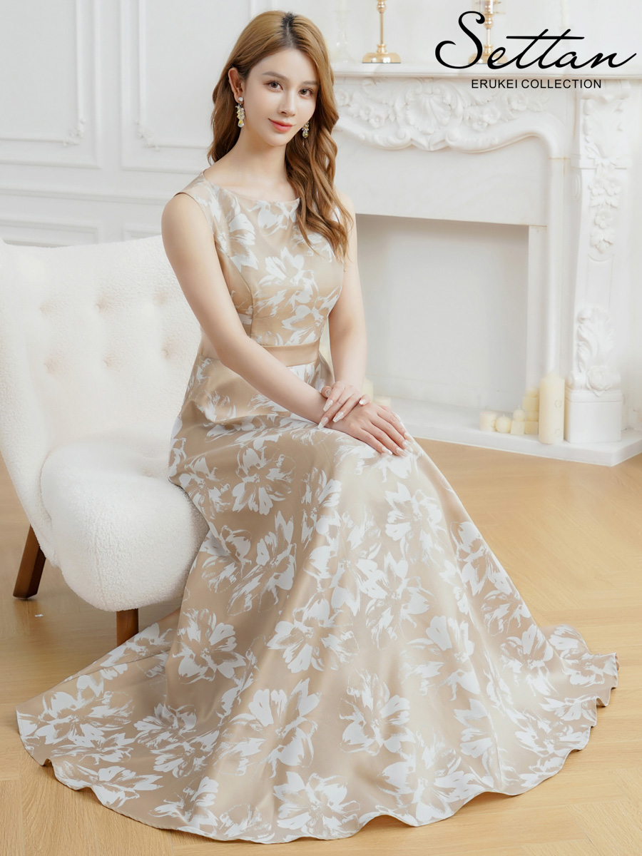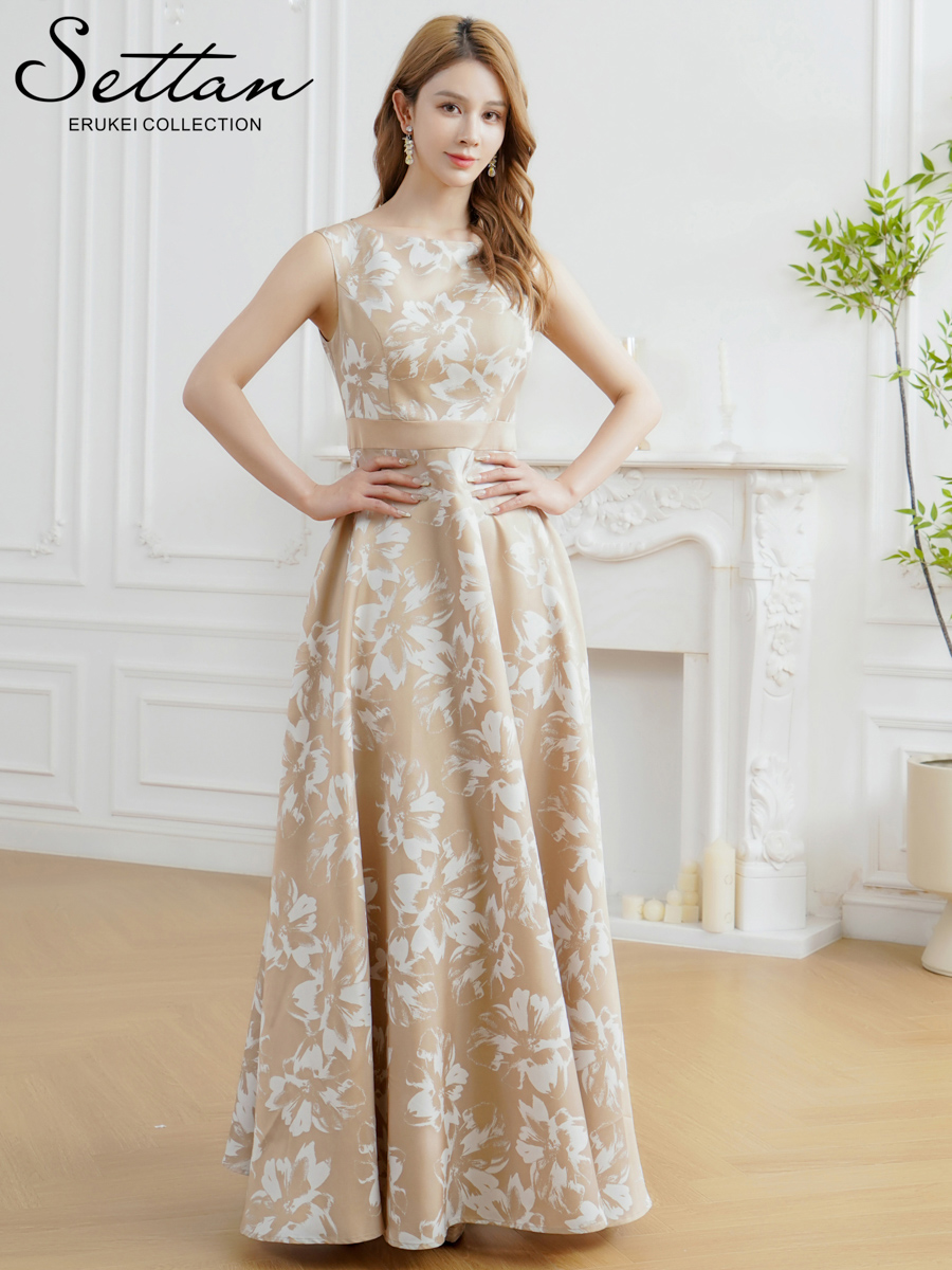 [送料無料][SETTAN]ベージュ・フラワープリント・花柄・ハイウエスト・ノースリーブ・ボートネック・Aライン・ロングドレス[即日発送][大きいサイズあり] [S25409]