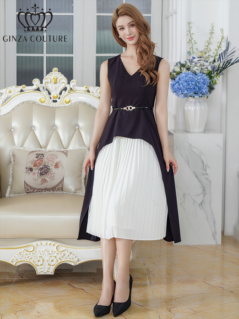 [送料無料][GINZA COUTURE]ブラック×ホワイト・バイカラー・ノースリーブ・Vネック・レイヤード・プリーツ・ベルト付き・Aライン・ミディアムドレス・ワンピース[即日発送][大きいサイズあり]