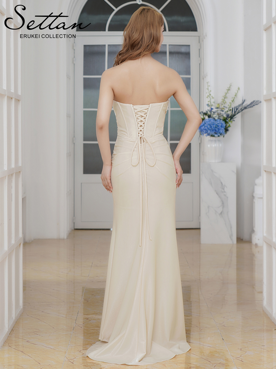 [送料無料][SETTAN]ブルー・ベージュ・アシンメトリー・ベア・タック・スピンドル・スリット・ストレッチ・タイト・マーメイド・ロングドレス[即日発送][大きいサイズあり] [S37207]