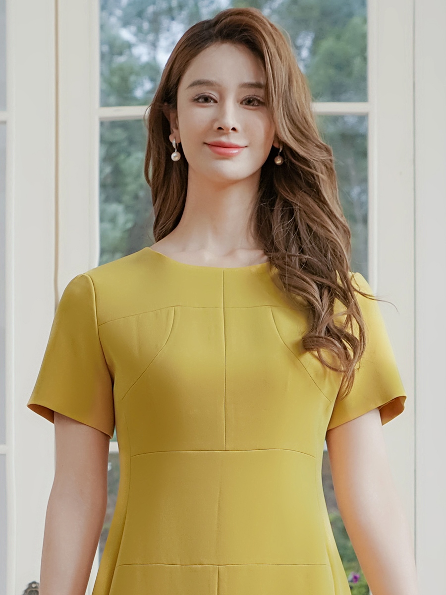 [送料無料][GINZA COUTURE]イエロー・ブルー・シンプル・半袖・無地・切替デザイン・タイト・膝丈・ミディアムドレス・ワンピース[即日発送][大きいサイズあり]