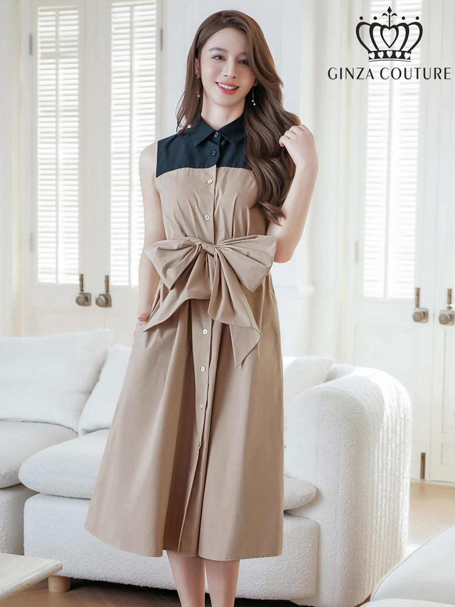 [送料無料][GINZA COUTURE]ブラック×ベージュ・バイカラー・ボタン・リボンベルト・カジュアル・ノースリーブ・切替・Aライン・ミディアムドレス・ワンピース[即日発送][大きいサイズあり]