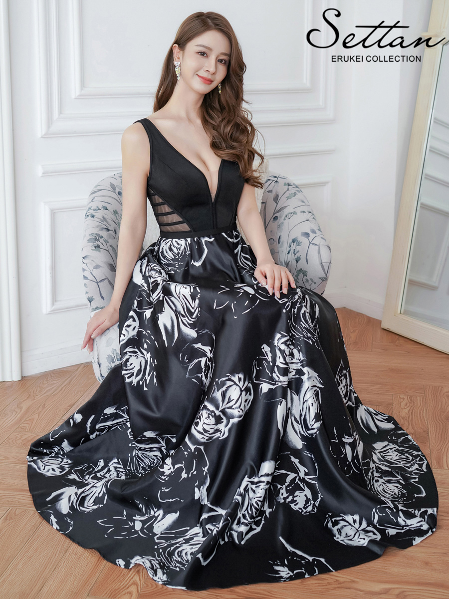 [送料無料][SETTAN]ブラック×ホワイト・ワインレッド×ホワイト・薔薇・花柄・プリント・サテン・セクシー・シースルー・Aライン・ロングドレス[即日発送][大きいサイズあり]